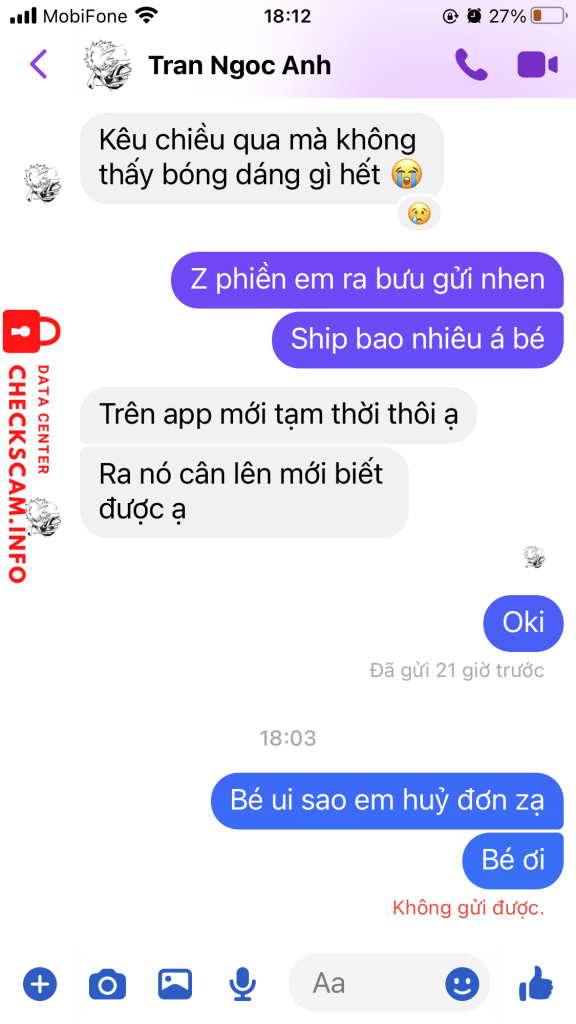 Scammer Alert: Tran Ngoc Anh Reported: November 16, 2024 Scammer Information Full Name: Tran Ngoc Anh Phone Number: 0927753820 Payment Gate: Momo Payment Account: 0927753820 Category: Marketplace scams Source: Checkscam Evidence Files Report Description Lừa đảo, nhận tiền xong block không gửi hàng Comments Your comment Add Comment No comments yet. Be the first to share your experience with this scammer.