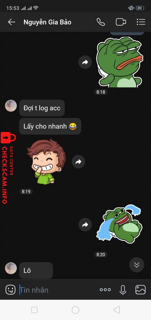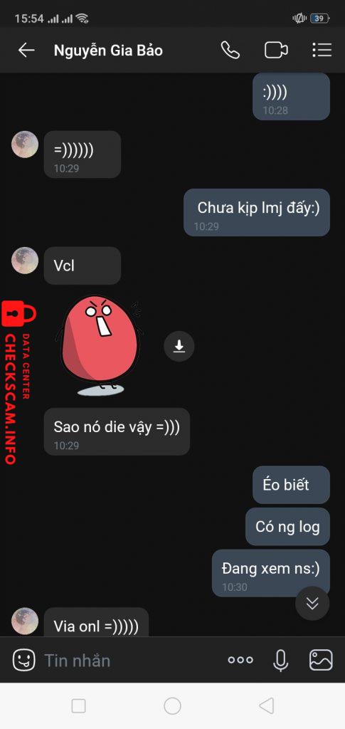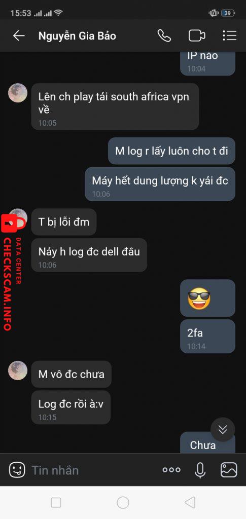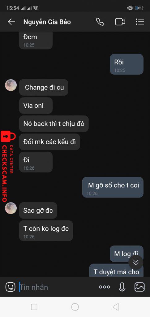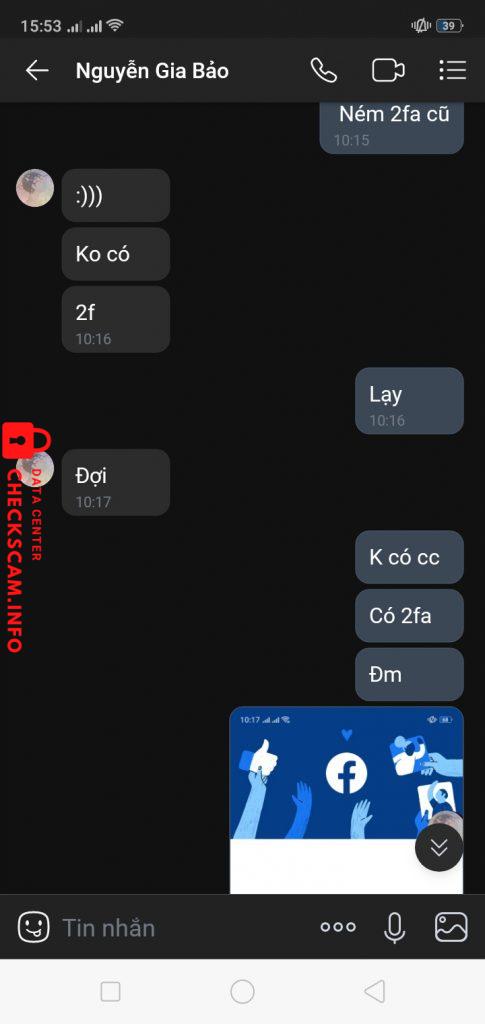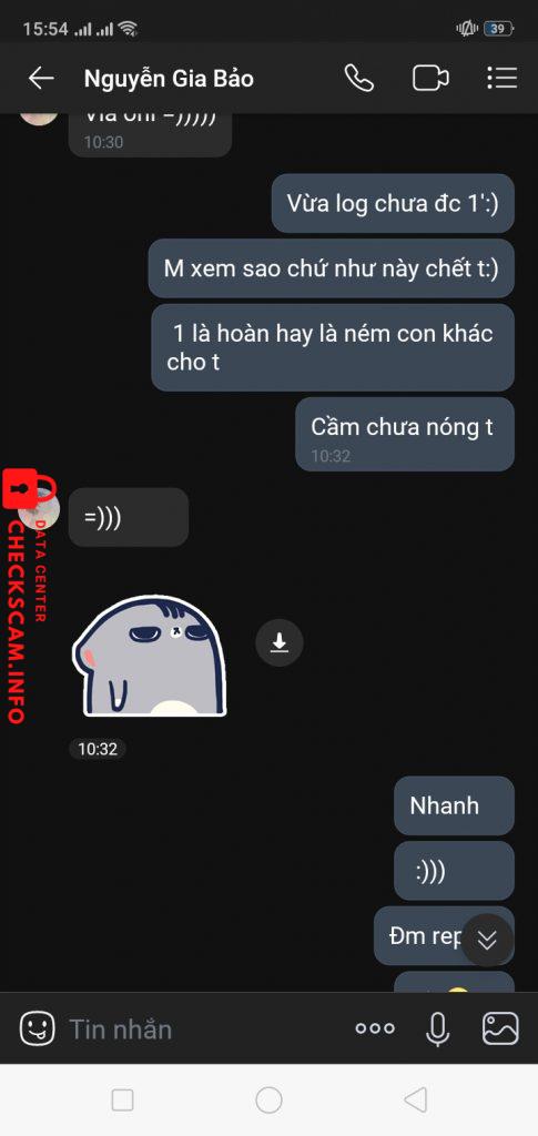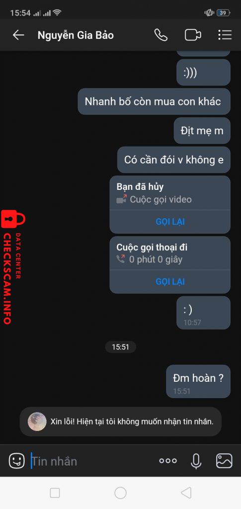 Scammer Alert: Nguyễn Gia Bảo Reported: November 16, 2024 Scammer Information Full Name: Nguyễn Gia Bảo Phone Number: 0964202831 Payment Gate: Momo Payment Account: 0964202831 Category: Marketplace scams Source: Checkscam Evidence Files Report Description Comments Your comment Add Comment No comments yet. Be the first to share your experience with this scammer.