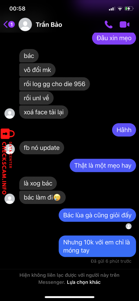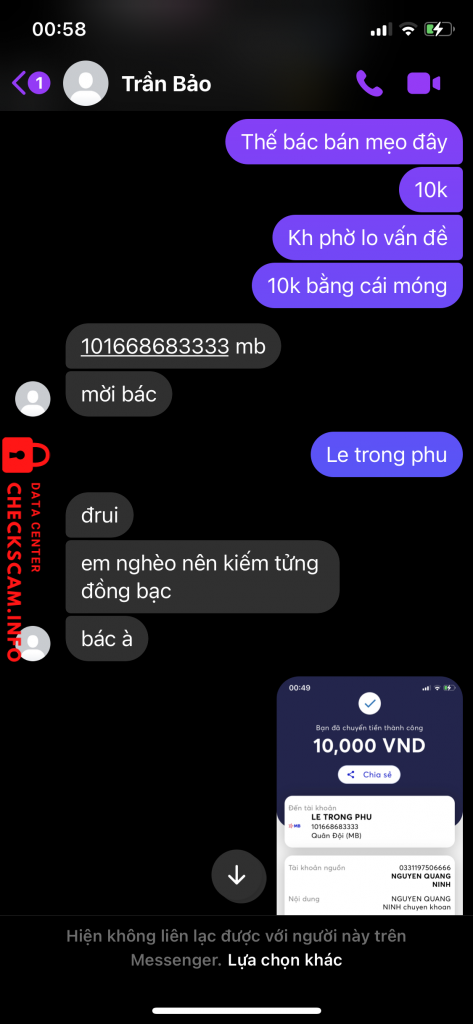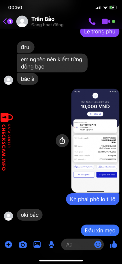 Scammer Alert: Le Trong Phu Reported: November 16, 2024 Scammer Information Full Name: Le Trong Phu Phone Number: 0775964356 Payment Gate: Mb Bank Payment Account: 101668683333 Category: Marketplace scams Source: Checkscam Evidence Files Report Description Lừa đảo bán tut bật chế độ chuyên nghiệp nhưng chặn facebook luôn Comments Your comment Add Comment No comments yet. Be the first to share your experience with this scammer.
