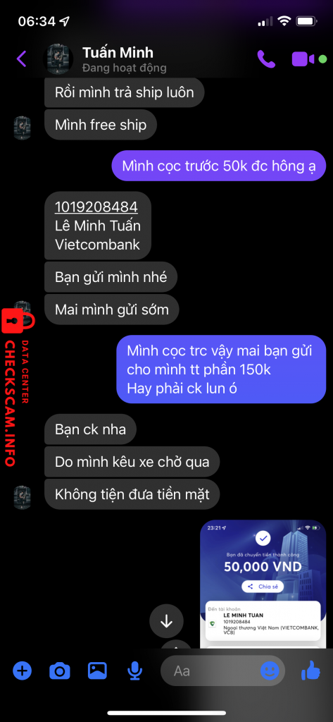 Scammer Alert: Lê minh tuấn Reported: November 16, 2024 Scammer Information Full Name: Lê minh tuấn Payment Gate: Vietcombank Payment Account: 1019208484 Category: Marketplace scams Source: Checkscam Evidence Files Report Description Buôn bán đồ cũ lừa gạt ck xong ko gửi hàng Facebook tuấn minh Comments Your comment Add Comment No comments yet. Be the first to share your experience with this scammer.
