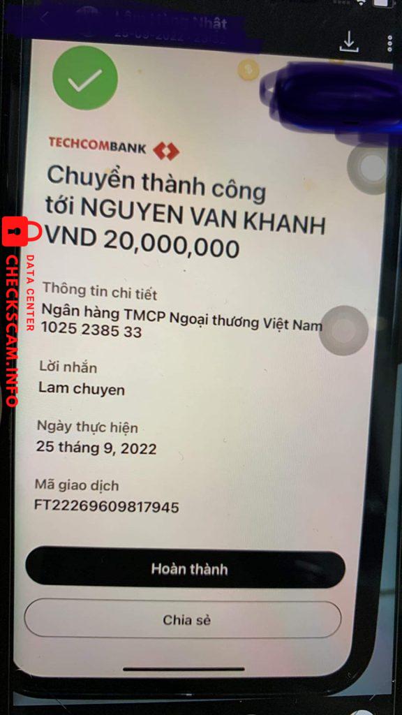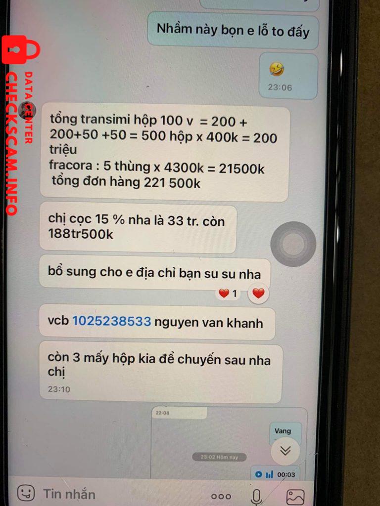 Scammer Alert: NGUYEN VAN KHANH Reported: November 16, 2024 Scammer Information Full Name: NGUYEN VAN KHANH Payment Gate: Vietcombank Payment Account: 1025238533 Category: Marketplace scams Source: Checkscam Evidence Files Report Description Tôi đã đặt hàng như trên nhưng đã chuyển tiền đến. Đến ngày nhận họ huy ae liên lạc với tôi Comments Your comment Add Comment No comments yet. Be the first to share your experience with this scammer.
