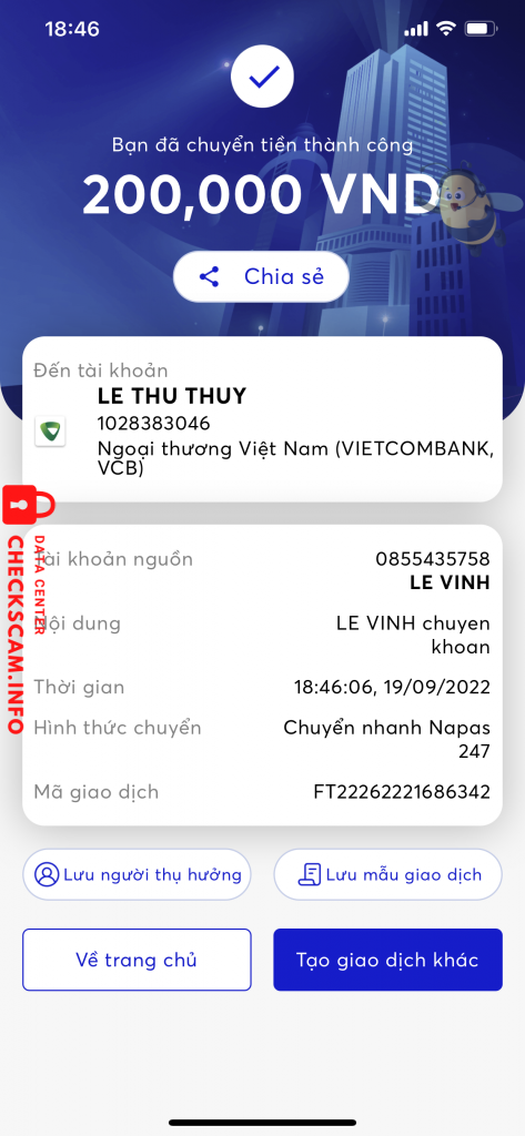Scammer Alert: Le thu thuy Reported: November 16, 2024 Scammer Information Full Name: Le thu thuy Phone Number: 0902987246 Payment Gate: Vietcombank Payment Account: 1028383046 Category: Marketplace scams Source: Checkscam Evidence Files Report Description Anh em cẩn thận nha bọn này lừa đảo chuyên nghiệp dụ anh em vào thế bị gài là dính liền Comments Your comment Add Comment No comments yet. Be the first to share your experience with this scammer.