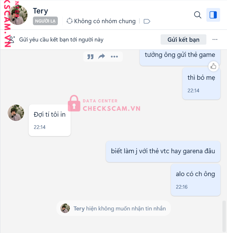 Scammer Alert: 109002360751 Reported: November 16, 2024 Scammer Information Full Name: 109002360751 Payment Gate: PV Bank Payment Account: 109002360751 Category: Marketplace scams Source: Checkscam Evidence Files Report Description mình mua thẻ cào điện thoại bị scam Comments Your comment Add Comment No comments yet. Be the first to share your experience with this scammer.
