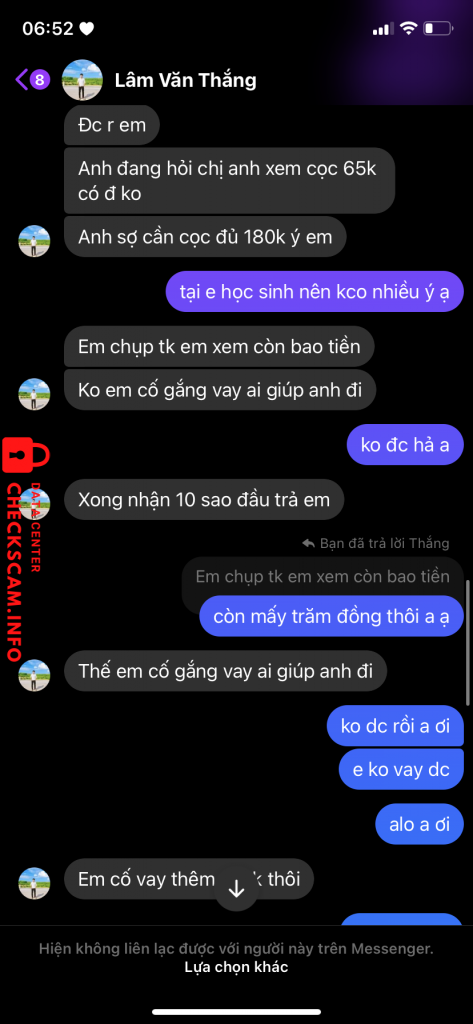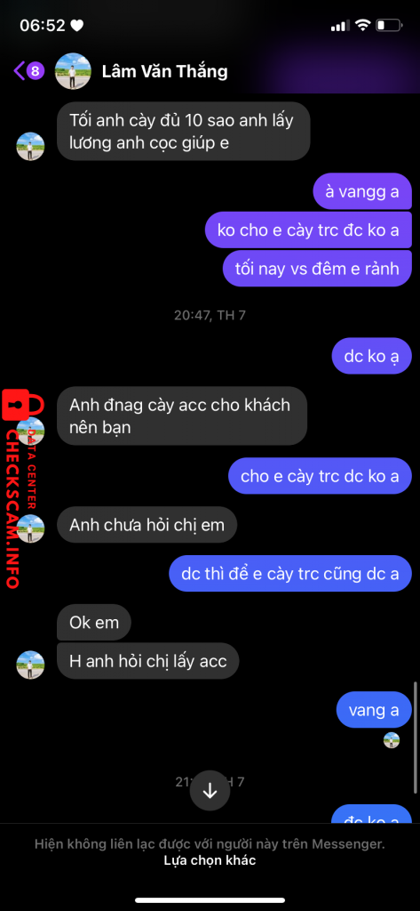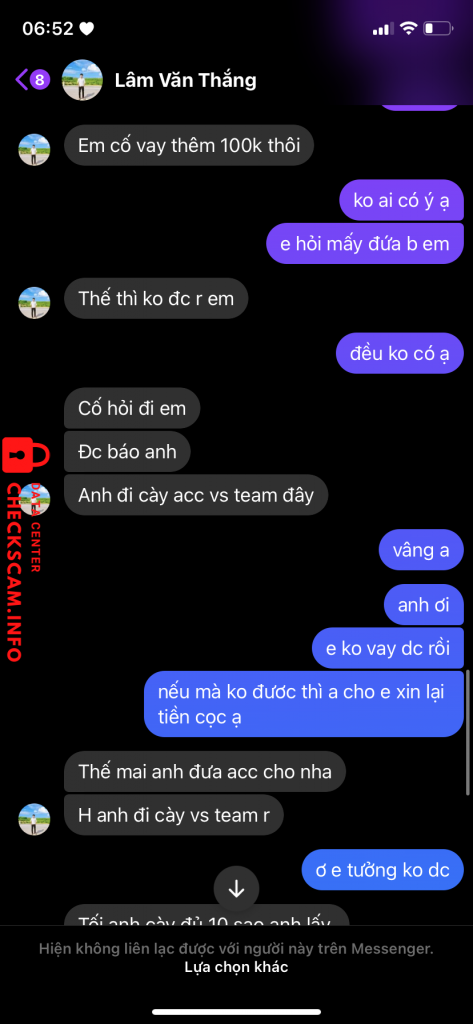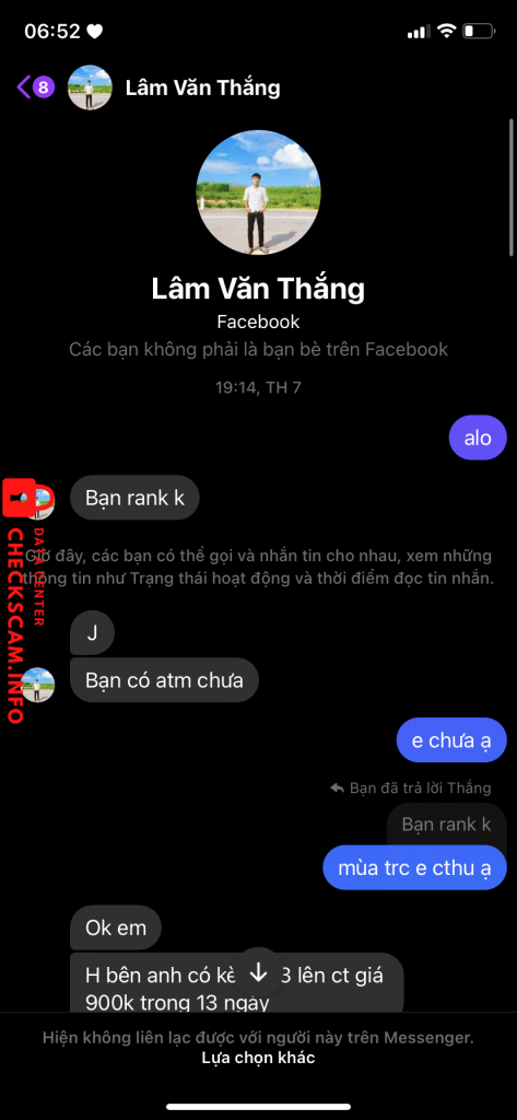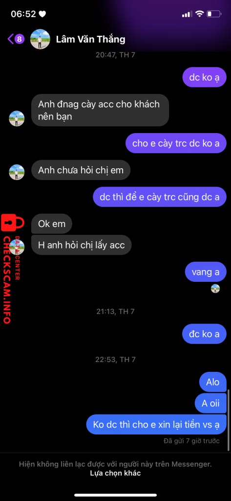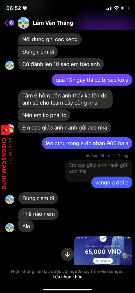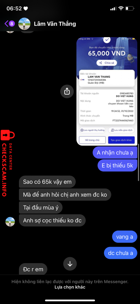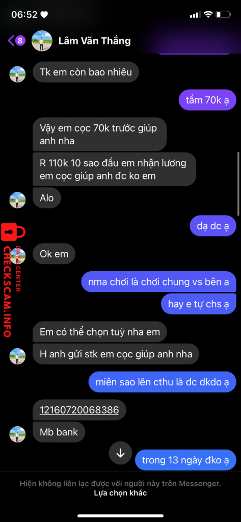 Scammer Alert: Lâm Văn Thắng Reported: November 16, 2024 Scammer Information Full Name: Lâm Văn Thắng Payment Gate: MB Bank Payment Account: 12160720068386 Category: Marketplace scams Source: Checkscam Evidence Files Report Description Lừa đảo bằng hình thức chơi game kiếm tiền qua mạng Comments Your comment Add Comment No comments yet. Be the first to share your experience with this scammer.