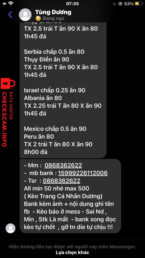Scammer Alert: Tùng Dương Reported: November 16, 2024 Scammer Information Full Name: Tùng Dương Phone Number: 0868362622 Payment Gate: Mb Bank Payment Account: 15999226112006 Category: Marketplace scams Source: Checkscam Evidence Files Report Description Trùm scam Comments Your comment Add Comment No comments yet. Be the first to share your experience with this scammer.