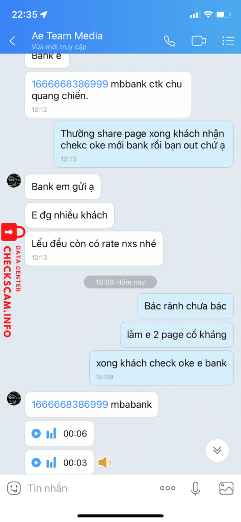 Scammer Alert: Chu Quang Chiến Reported: November 16, 2024 Scammer Information Full Name: Chu Quang Chiến Payment Gate: MB Bank Payment Account: 1666668386999 Category: Marketplace scams Source: Checkscam Evidence Files Report Description Bán page cho em nhưng không giao page rồi chặn nick lặn ạ. Thủ đoạn đổi tên liên tục đi lừa Comments Your comment Add Comment No comments yet. Be the first to share your experience with this scammer.