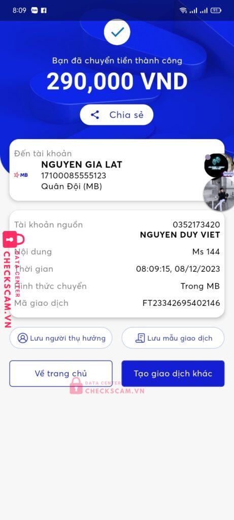 Scammer Alert: NGUYEN GIA LAT Reported: November 16, 2024 Scammer Information Full Name: NGUYEN GIA LAT Payment Gate: Mb bank Payment Account: 17100085555123 Category: Marketplace scams Source: Checkscam Evidence Files Report Description Comments Your comment Add Comment No comments yet. Be the first to share your experience with this scammer.