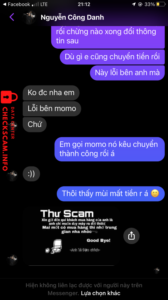 Scammer Alert: NGUYỄN CÔNG DANH Reported: November 16, 2024 Scammer Information Full Name: NGUYỄN CÔNG DANH Phone Number: 0362623976 Payment Gate: ACB Payment Account: 18254087 Category: Marketplace scams Source: Checkscam Evidence Files Report Description Bank tiền xong kêu lỗi chưa nhận được, đòi bank thêm tiền Comments Your comment Add Comment No comments yet. Be the first to share your experience with this scammer.