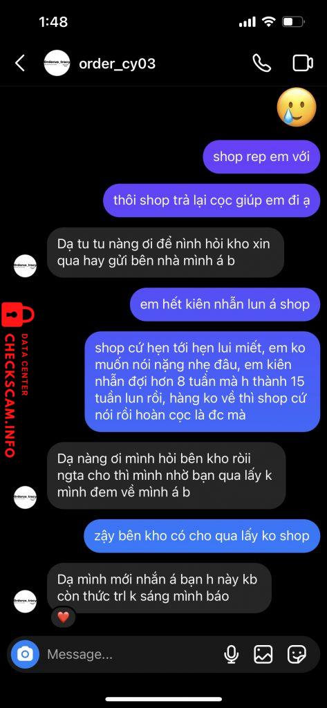 Mình có order 1 chai nước hoa bên shop orderus_tracy 15 tuần nhưng hàng không về, hẹn lên hẹn xuống, không hoàn trả lại cọc dù mình đã yêu cầu nhiều lần. Shop bảo bị mất nick 2 lần, hiện đã đổi là order_cy03/orderus_tr.ac.y/order_uscy1/orderus_tracysame04.