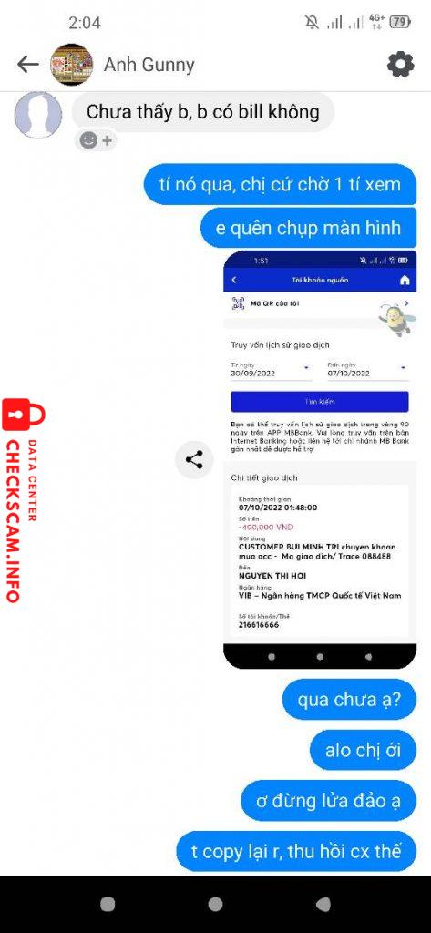 Scammer Alert: NGUYEN THI HOI Reported: November 16, 2024 Scammer Information Full Name: NGUYEN THI HOI Phone Number: 0817983749 Payment Gate: VIB Payment Account: 216616666 Category: Marketplace scams Source: Checkscam Evidence Files Report Description bán acc game gunny pc, bank xong gửi acc nhưng sau khi nhận tiền thì block ạ Comments Your comment Add Comment No comments yet. Be the first to share your experience with this scammer.