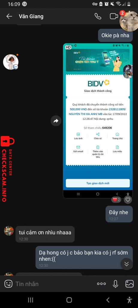 Scammer Alert: NGUYEN THI HA ANH Reported: November 16, 2024 Scammer Information Full Name: NGUYEN THI HA ANH Payment Gate: MB BANK Payment Account: 2328111805 Category: Marketplace scams Source: Checkscam Evidence Files Report Description SCAM 2K11 NÓI CHUYỆN VÔ HỌC CÓ GẶP NÉ NGAY LẬP TỨC ‼️‼️‼️ Comments Your comment Add Comment No comments yet. Be the first to share your experience with this scammer.