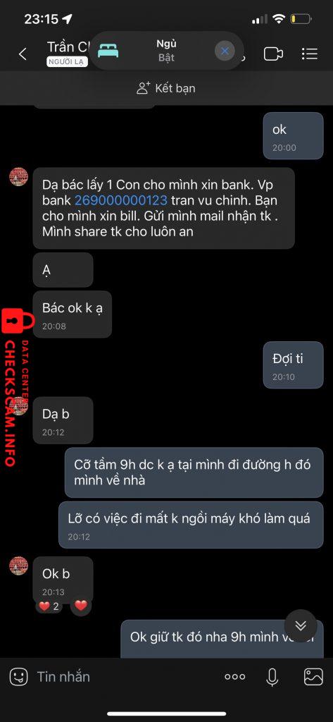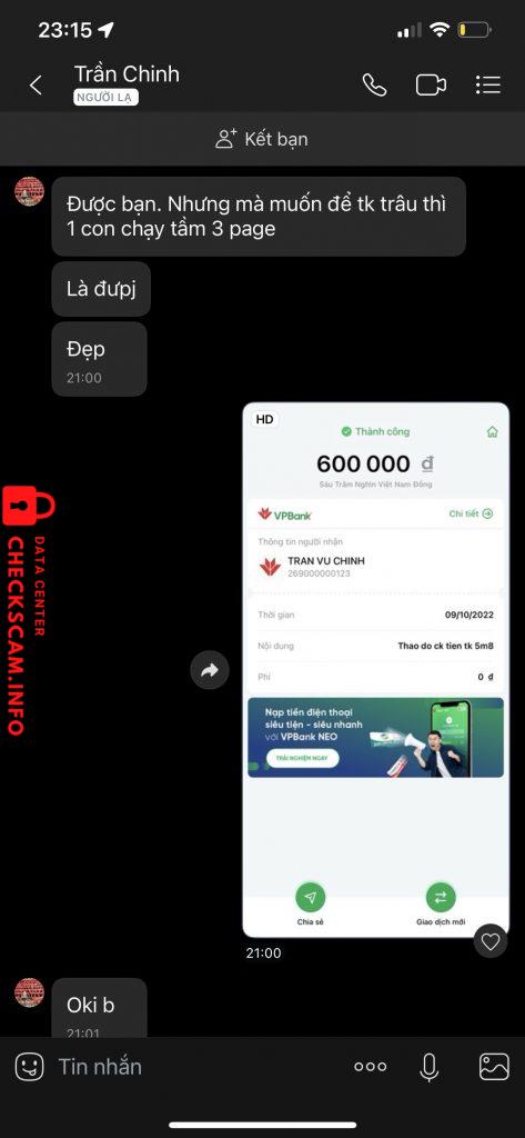 Scammer Alert: TRAN VU CHINH Reported: November 16, 2024 Scammer Information Full Name: TRAN VU CHINH Phone Number: 0587978235 Payment Gate: VP BANK Payment Account: 269000000123 Category: Marketplace scams Source: Checkscam Evidence Files Report Description lừa đảo. né thằng chó này ra nha mọi người Comments Your comment Add Comment No comments yet. Be the first to share your experience with this scammer.
