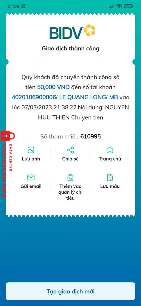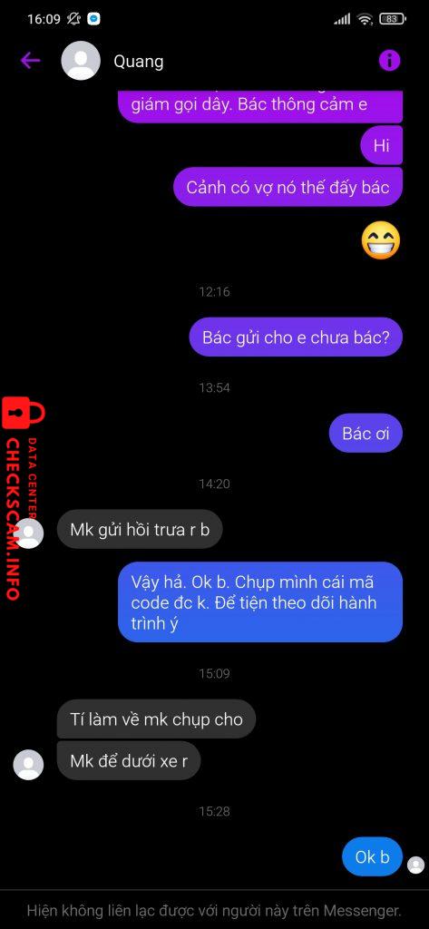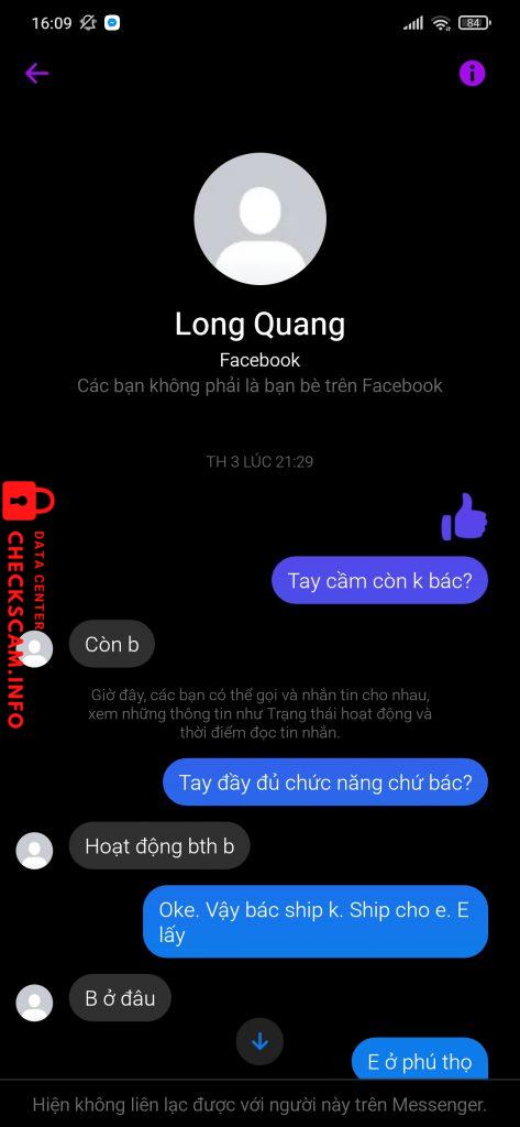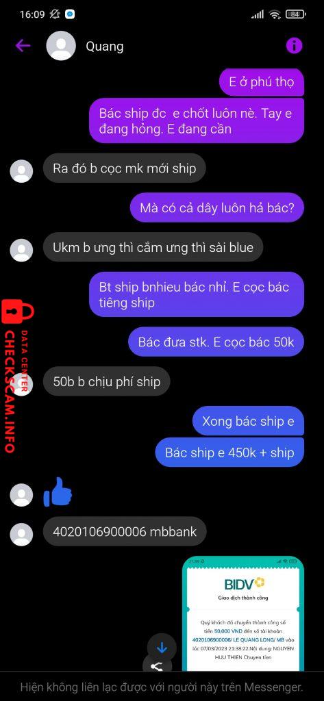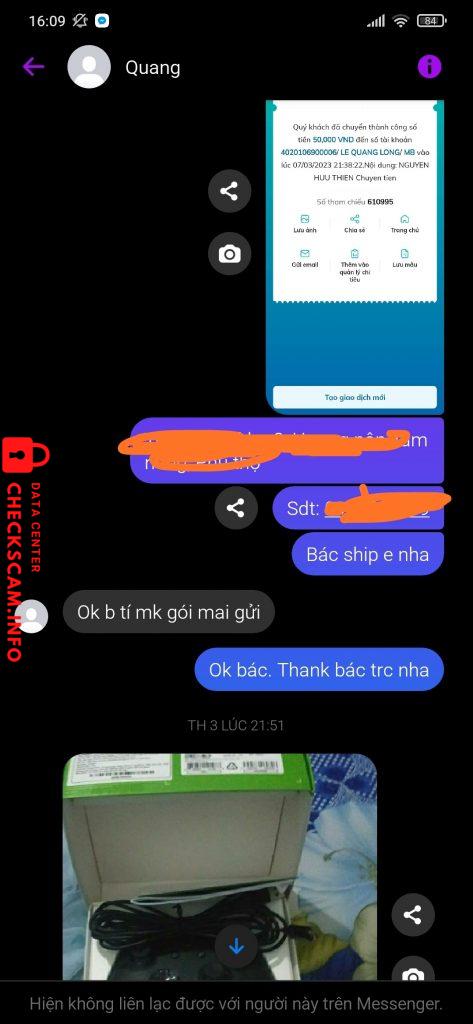 Scammer Alert: Lê Quang Long Reported: November 16, 2024 Scammer Information Full Name: Lê Quang Long Phone Number: 0795978382 Payment Gate: Mb Payment Account: 4020106900006 Category: Marketplace scams Source: Checkscam Evidence Files Report Description Chuyên vào các nhóm đăng bán rẻ rồi lừa cọc Comments Your comment Add Comment No comments yet. Be the first to share your experience with this scammer.