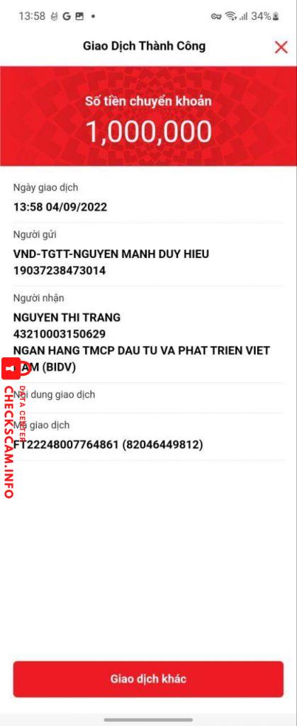 Scammer Alert: Nguyen Thi Trang Reported: November 16, 2024 Scammer Information Full Name: Nguyen Thi Trang Payment Gate: BIDV Payment Account: 43210003150629 Category: Marketplace scams Source: Checkscam Evidence Files Report Description Lừa đảo mua bán paypal rồi block Comments Your comment Add Comment No comments yet. Be the first to share your experience with this scammer.