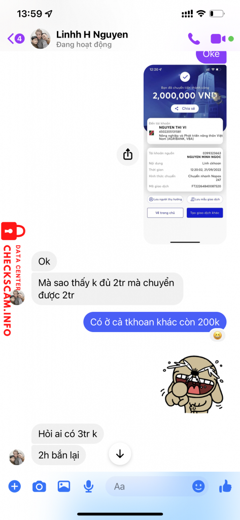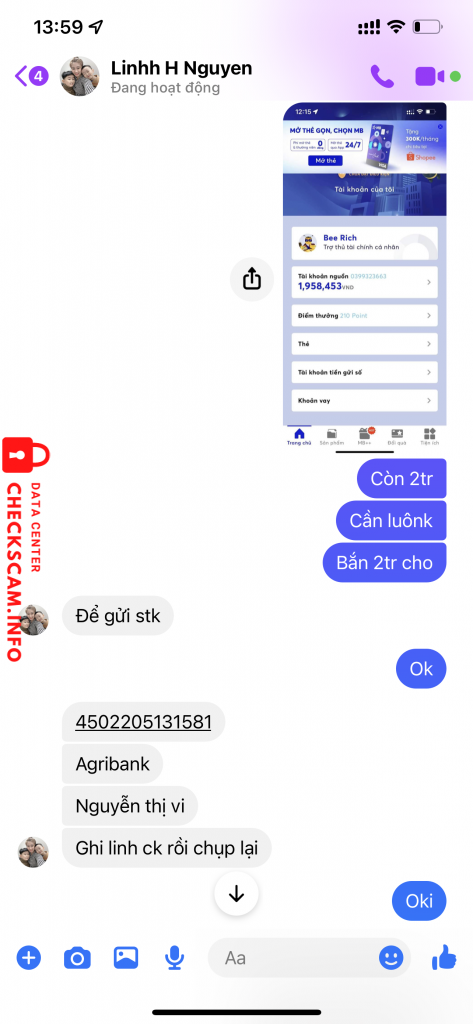 Scammer Alert: NGUYEN THI VI Reported: November 16, 2024 Scammer Information Full Name: NGUYEN THI VI Payment Gate: Agribank Payment Account: 4502205131581 Category: Marketplace scams Source: Checkscam Evidence Files Report Description Lừa đảo chuyên nghiệp quá rồi. Chúng tôi muốn đòi lại tiền. Comments Your comment Add Comment No comments yet. Be the first to share your experience with this scammer.