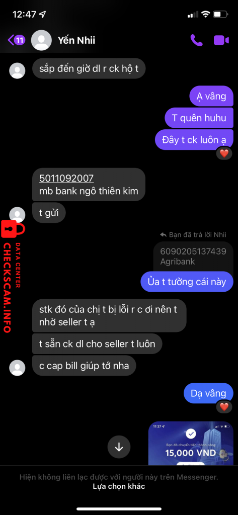 Scammer Alert: Ngô Thiên Kim Reported: November 16, 2024 Scammer Information Full Name: Ngô Thiên Kim Payment Gate: Mb bank Payment Account: 5011092007 Category: Marketplace scams Source: Checkscam Evidence Files Report Description Con nhỏ này đi scam thẻ bo góc nha Nó còn 1 tài khoản nữa Comments Your comment Add Comment No comments yet. Be the first to share your experience with this scammer.