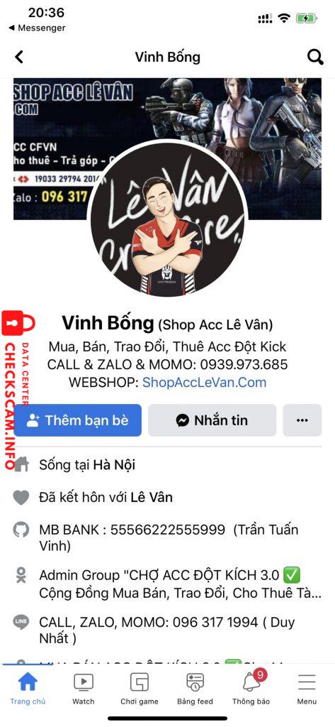 Các dấu hiệu thể hiện lừa đảo – SCAM: Dùng tài khoản facebook Vinh Bống giống tên facebook (https://www.facebook.com/SHOPACCLEVAN) và thông tin shop https://shopacclevan.com/ để chào bán nick game CROSSFIRE giá rẻ trên GROUP MUA BÁN – TRAO ĐỔI – CHO THUÊ ACC CF MIỄN PHÍ. Khi khách hàng có nhu cầu gọi điện hỏi thông tin chính chủ 0963171994 trên https://shopacclevan.com/ thì nói rất bận, trao đổi mua bán nhanh, nói chuyện qua messenger, zalo thì không trả lời, không kết bạn! Gọi điện đến số điện thoại 0939973685 thì nói rằng có sử dụng 2 số điện thoại, nhưng tài khoản ngân hàng TECHCOMBANK 19033297942014 bị lỗi, nên chuyển đến số tài khoản ngân hàng MBBANK 55566222555999, đều mang tên LÊ TUẤN VINH. Sau đó, dùng thủ đoạn thông báo rằng có rất nhiều khách hỏi mua, yêu cầu khách hàng phải chuyển tiền nhanh chứ không bán cho người khác. Khách gọi điện xác minh lại số điện thoại 0963171994 thì không nghe máy, nhắn tin, kết bạn vẫn không trả lời. Sau khi khách hàng chuyển 350.000 đồng thì chặn liên lạc. GROUP MUA BÁN – TRAO ĐỔI – CHO THUÊ ACC CF MIỄN PHÍ do tài khoản Vinh Bống quản lý gồm khoảng 20.000 thành viên thì ẩn GROUP chặn tài khoản facebook khách hàng, không cho phản ánh.
