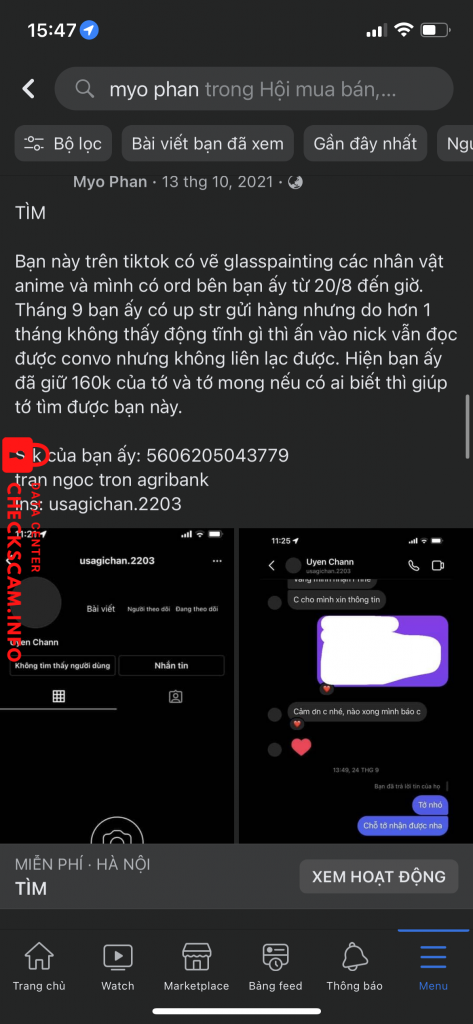 Scammer Alert: TRAN NGOC TRON Reported: November 16, 2024 Scammer Information Full Name: TRAN NGOC TRON Payment Gate: Agribank Payment Account: 5606205043779 Category: Marketplace scams Source: Checkscam Evidence Files Report Description Mở glasspainting xong không trả hàng từ 2021 đến giờ Comments Your comment Add Comment No comments yet. Be the first to share your experience with this scammer.