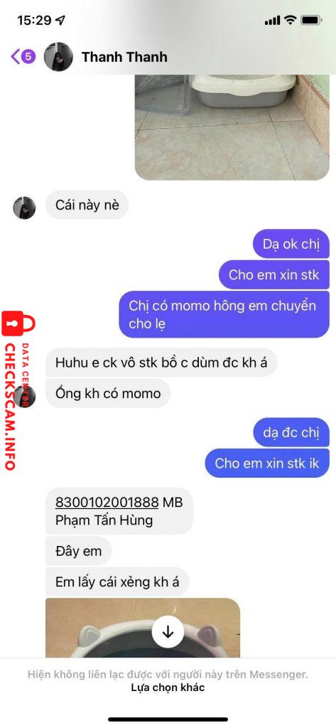 Scammer Alert: PHẠM TẤN HÙNG Reported: November 16, 2024 Scammer Information Full Name: PHẠM TẤN HÙNG Payment Gate: MB Payment Account: 8300102001888 Category: Marketplace scams Source: Checkscam Evidence Files Report Description Rao thanh lý đồ dùng chó mèo, lừa chuyển khoản thanh toán trước để có freeship xong block Comments Your comment Add Comment No comments yet. Be the first to share your experience with this scammer.