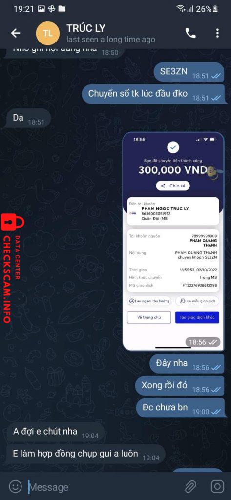 Scammer Alert: TRÚC LY Reported: November 16, 2024 Scammer Information Full Name: TRÚC LY Phone Number: 0584119969 Payment Gate: MB Bank Payment Account: 8656005051992 Category: Marketplace scams Source: Checkscam Evidence Files Report Description Lừa đảo trên telegram Comments Your comment Add Comment No comments yet. Be the first to share your experience with this scammer.