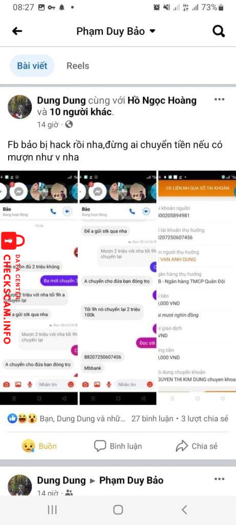 Scammer Alert: LE VAN ANH DUNG Reported: November 16, 2024 Scammer Information Full Name: LE VAN ANH DUNG Payment Gate: MB Bank Payment Account: 88207250607456 Category: Marketplace scams Source: Checkscam Evidence Files Report Description Hack tài khoản Facebook đi mượn tiền người khác Comments Your comment Add Comment No comments yet. Be the first to share your experience with this scammer.