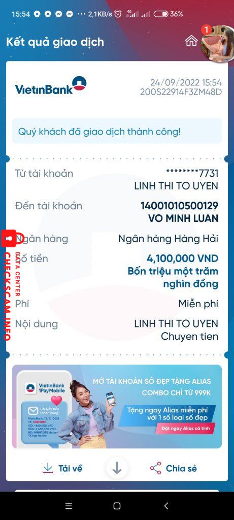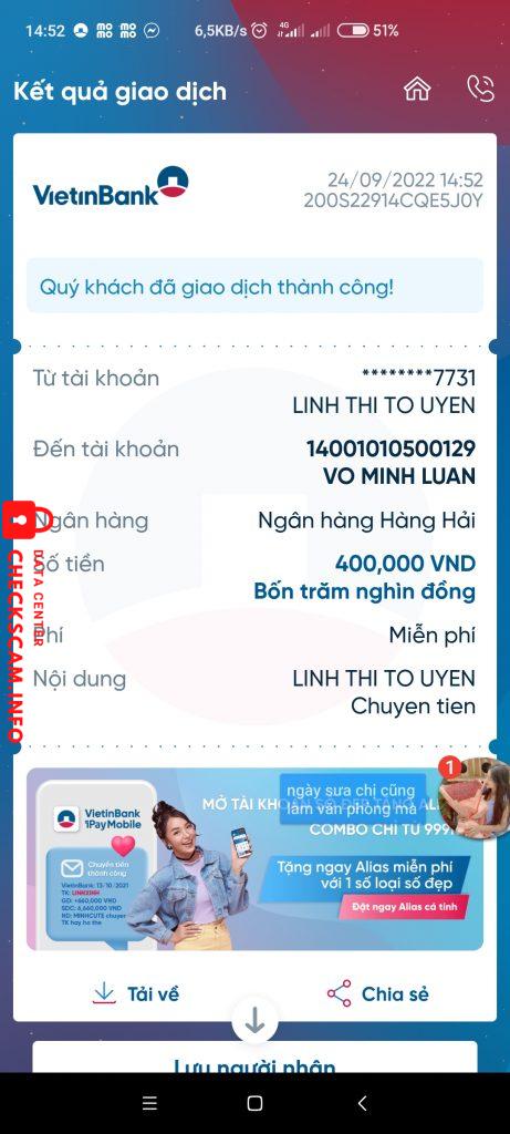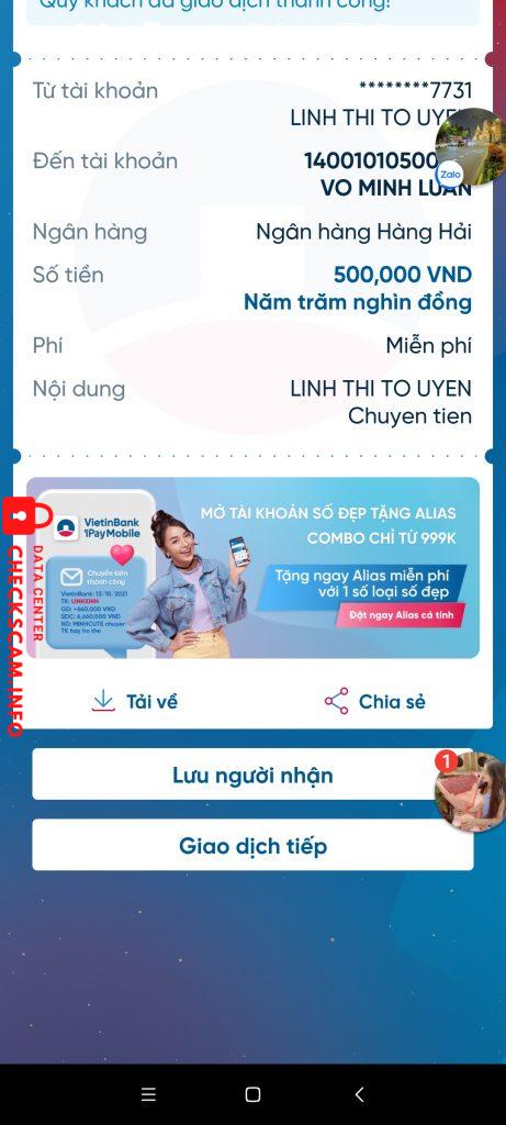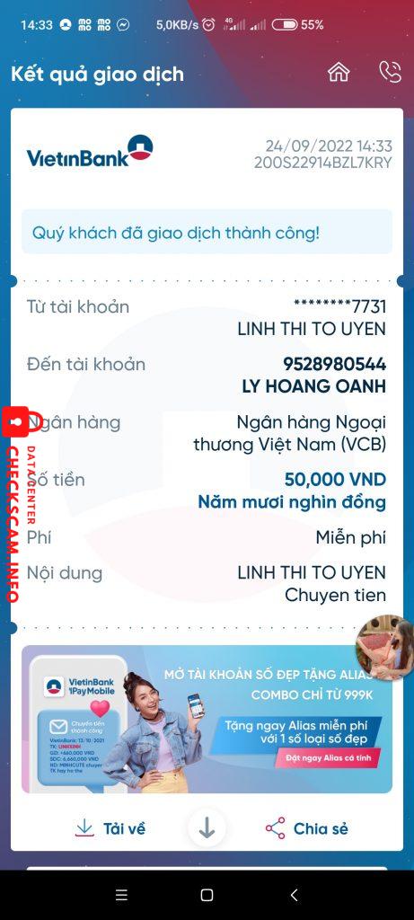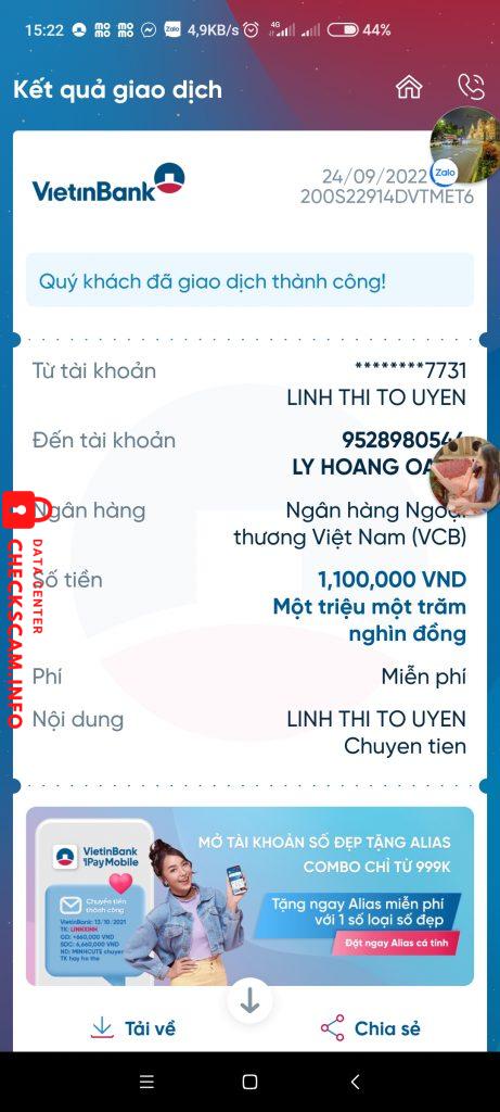 Scammer Alert: Ly Hoang Oanh Reported: November 16, 2024 Scammer Information Full Name: Ly Hoang Oanh Payment Gate: Vietcombank Payment Account: 9528980544 Category: Marketplace scams Source: Checkscam Evidence Files Report Description Moon người cẩn thận k lại bị lừa nhiều mk. Mong sao những người như thế này phải chịu hình phạt thích đáng Comments Your comment Add Comment No comments yet. Be the first to share your experience with this scammer.