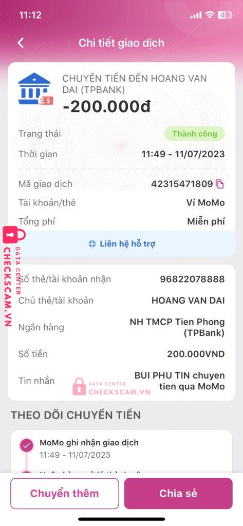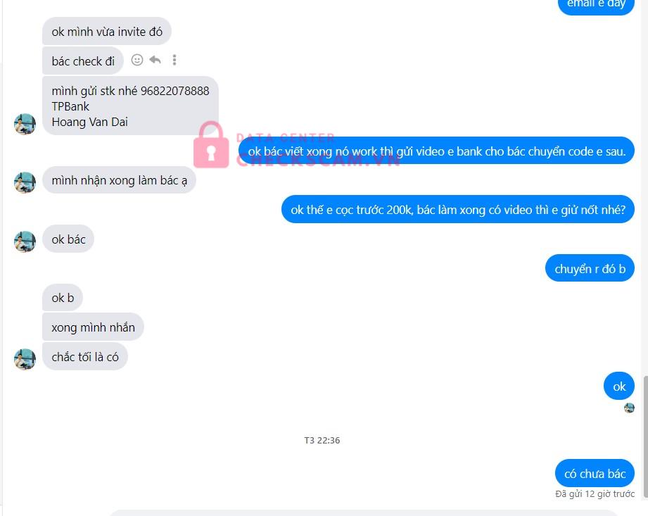 Scammer Alert: 96822078888 Reported: November 16, 2024 Scammer Information Full Name: 96822078888 Payment Gate: TPBank Payment Account: 96822078888 Category: Marketplace scams Source: Checkscam Evidence Files Report Description có 2 lít cũng đi lừa đảo 🙂 Comments Your comment Add Comment No comments yet. Be the first to share your experience with this scammer.