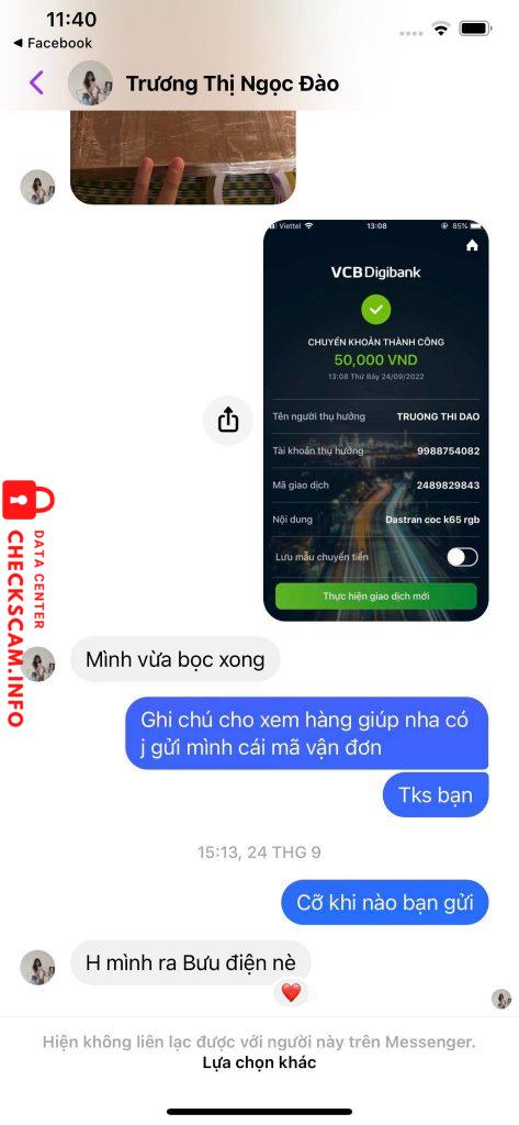 Scammer Alert: Truong Thi Dao Reported: November 16, 2024 Scammer Information Full Name: Truong Thi Dao Payment Gate: viet com bank Payment Account: 9988754082 Category: Marketplace scams Source: Checkscam Evidence Files Report Description cọc mua phím r block luôn Comments Your comment Add Comment No comments yet. Be the first to share your experience with this scammer.