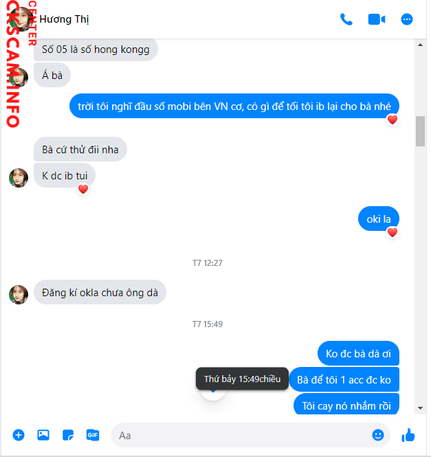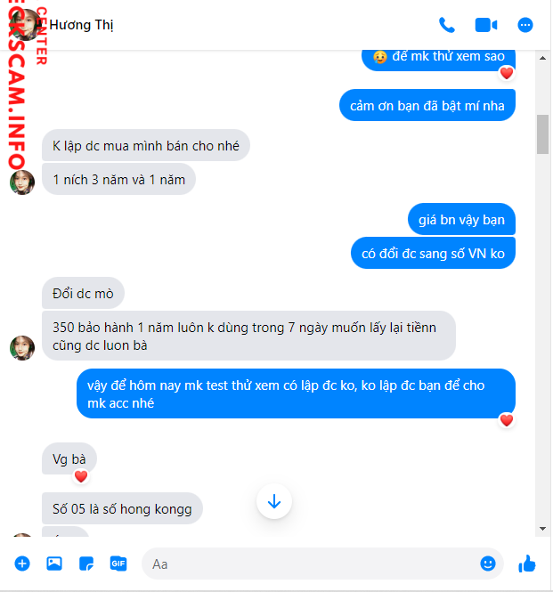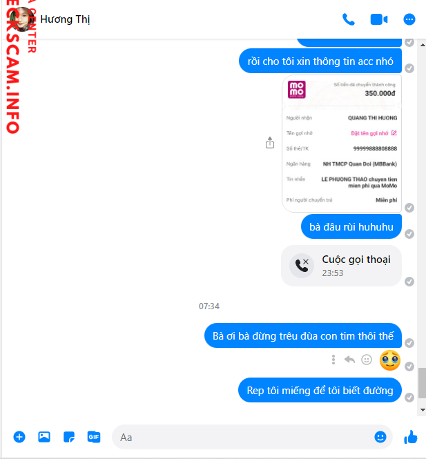 Scammer Alert: Quang Thi Huong Reported: November 16, 2024 Scammer Information Full Name: Quang Thi Huong Payment Gate: Ngân hàng Quân đội Payment Account: 99999888808888 Category: Marketplace scams Source: Checkscam Evidence Files Report Description Lừa đảo tiền bán acc, cụ thể là acc QQ Comments Your comment Add Comment No comments yet. Be the first to share your experience with this scammer.