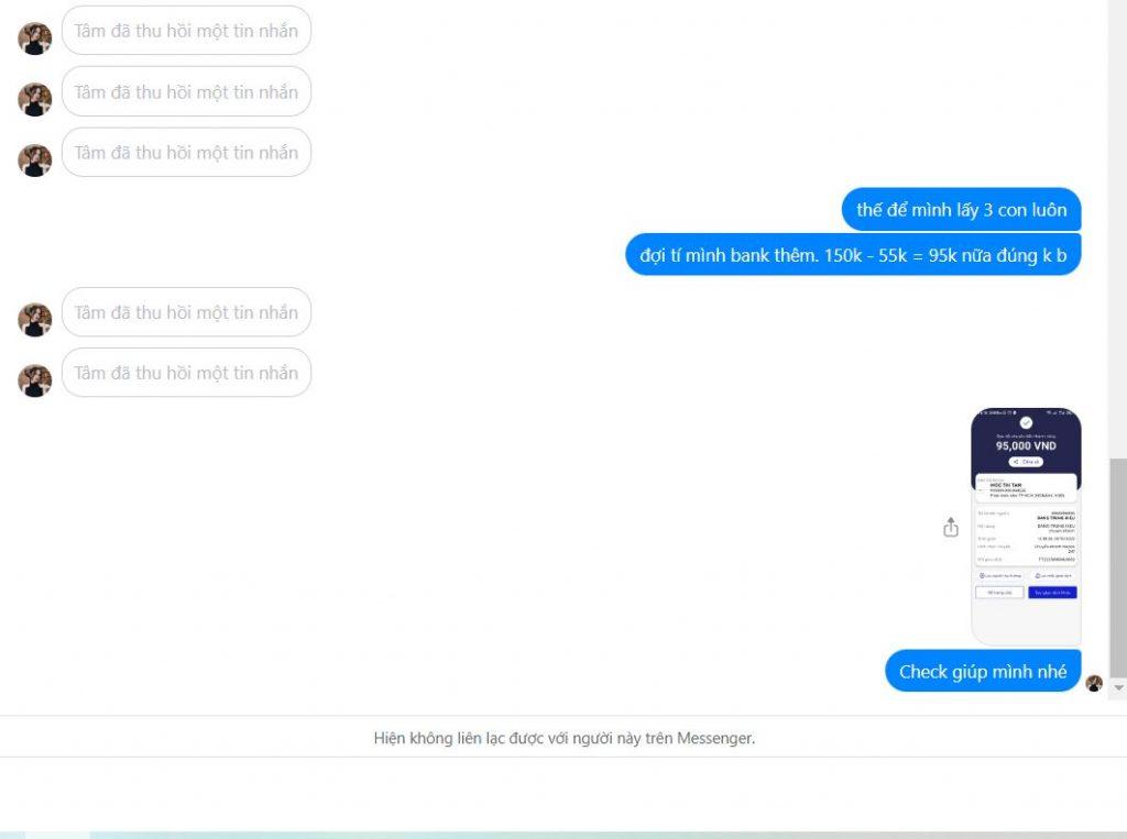 Lừa đảo bán via xmdt. báo giá 55k 1 con, mình bank 55k, xong nhắn là kho xuất min 3 con, bank thêm 2 con thì oke, giảm còn 50k 1 con, mình bank thêm 95k, xong thu hồi hết tin nhắn và chặn mình