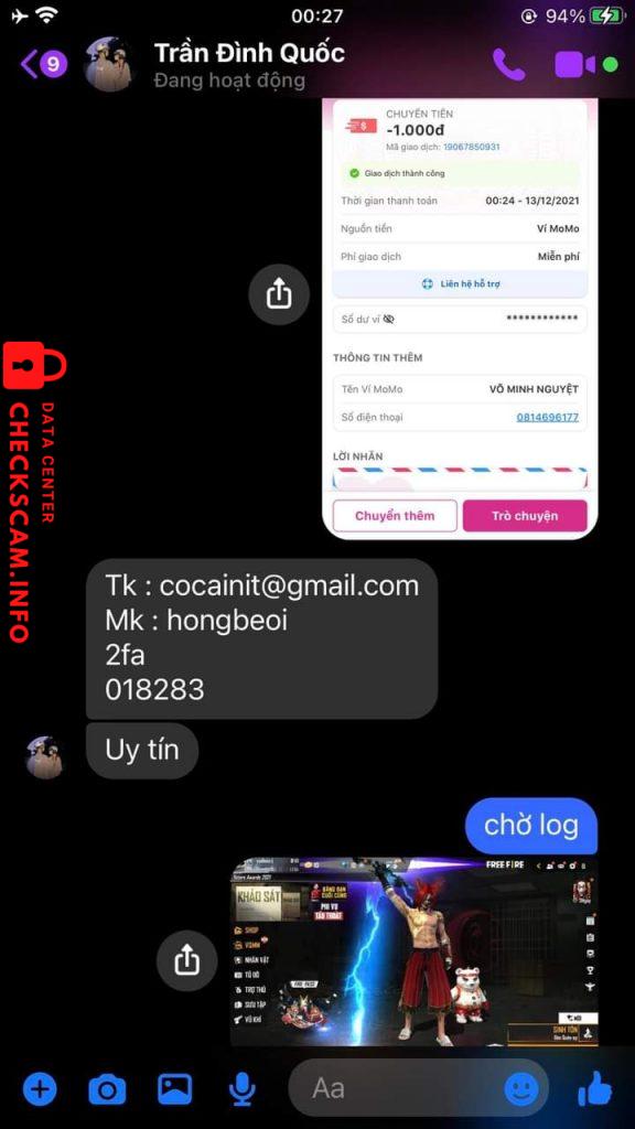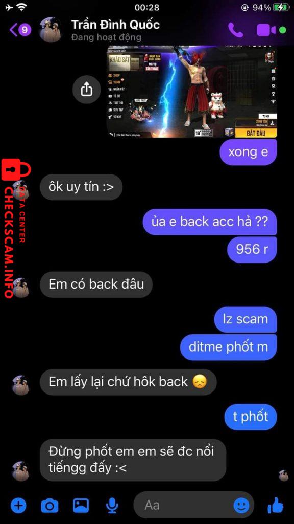 Scammer Alert: Trần Đình Quốc Reported: November 16, 2024 Scammer Information Full Name: Trần Đình Quốc Phone Number: 0814696177 Payment Gate: MoMo Payment Account: 0814696177 Category: Marketplace scams Source: Checkscam Evidence Files Report Description Bán Acc Xong Back Lại =)) Comments Your comment Add Comment No comments yet. Be the first to share your experience with this scammer.