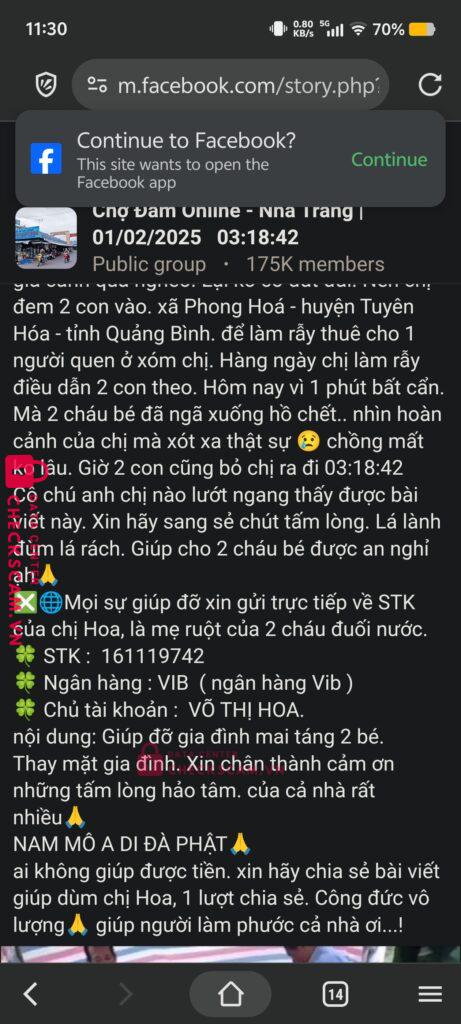 Scammer Alert: VÕ THỊ HOA Reported: March 7, 2025 Scammer Information Full Name: VÕ THỊ HOA Payment Gate: Vib Payment Account: 161119742 Category: Marketplace scams Source: Checkscam Evidence Files Report Description 2 câu chuyện khác nhau, cùng stk ngân hàng. Scam Comments Your comment Add Comment No comments yet. Be the first to share your experience with this scammer.
