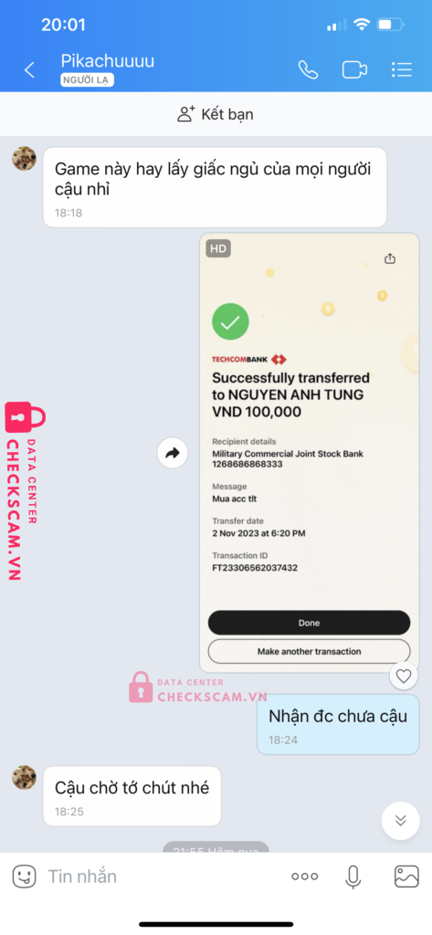 Scammer Alert: BAN THI HANG Reported: November 16, 2024 Scammer Information Full Name: BAN THI HANG Payment Gate: Mbbank Payment Account: 86070166888866 Category: Marketplace scams Source: Checkscam Evidence Files Report Description Lừa đảo cọc acc 200k đã chặn zalo tôi Comments Your comment Add Comment No comments yet. Be the first to share your experience with this scammer.