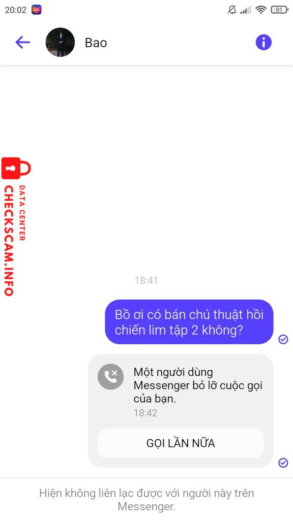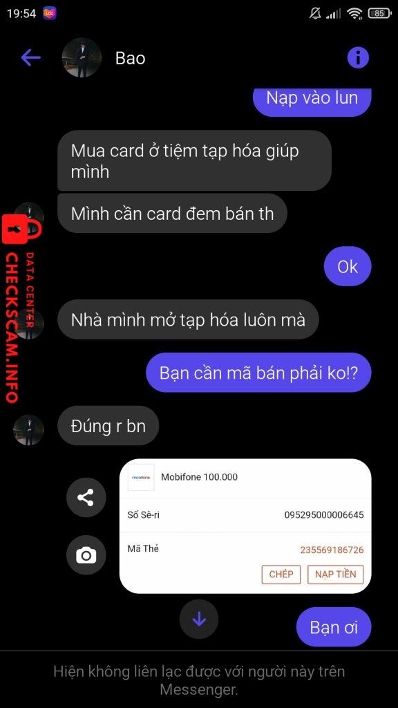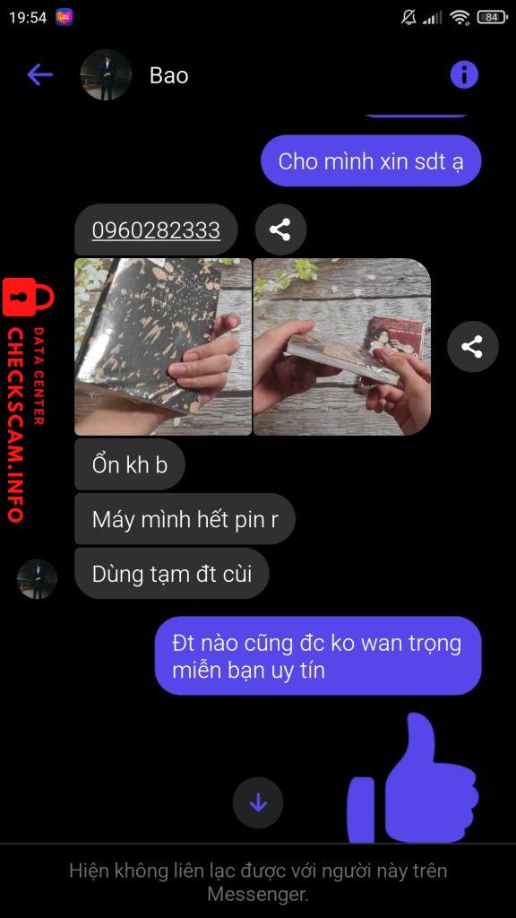 Scammer Alert: Bao Bao Reported: November 16, 2024 Scammer Information Full Name: Bao Bao Phone Number: 0960282333 Payment Gate: Không có Payment Account: 0000 Category: Marketplace scams Source: Checkscam Evidence Files Report Description Không liên hệ được sdt, không giao dịch thanh toán bằng chuyển khoản hay ví điện tử, scamer và chỉ nhận card điện thoại => lừa đảo buôn bán Comments Your comment Add Comment No comments yet. Be the first to share your experience with this scammer.
