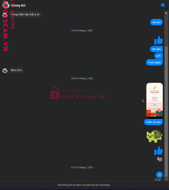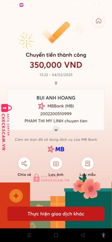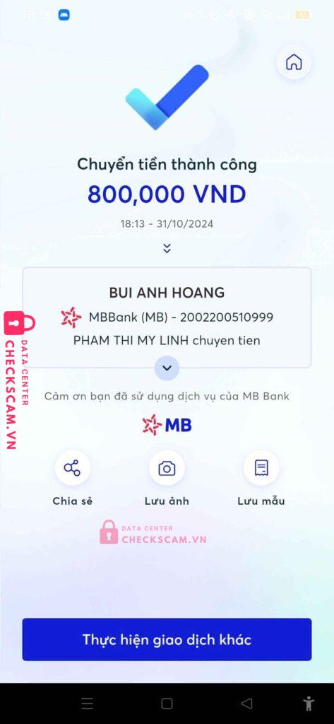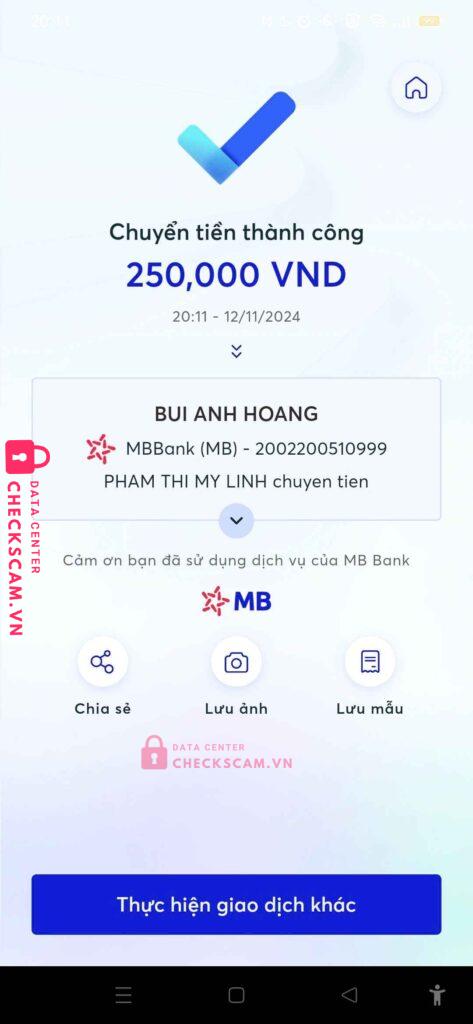 Scammer Alert: BUI ANH HOANG Reported: March 7, 2025 Scammer Information Full Name: BUI ANH HOANG Payment Gate: MBBANK Payment Account: 2002200510999 Category: Marketplace scams Source: Checkscam Evidence Files Report Description scam acc ff Comments Your comment Add Comment No comments yet. Be the first to share your experience with this scammer.