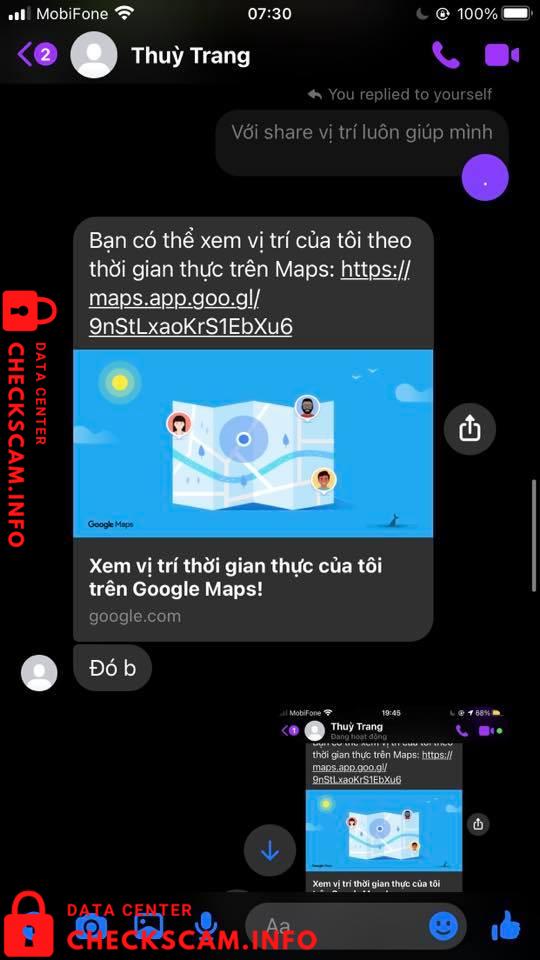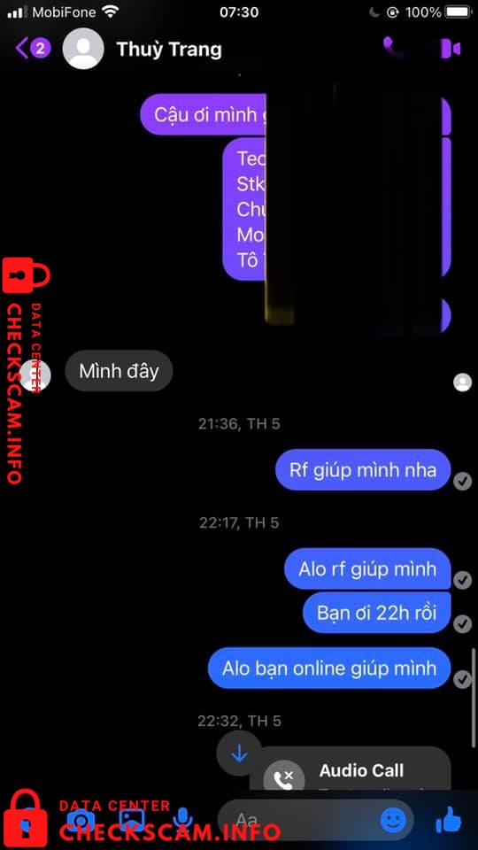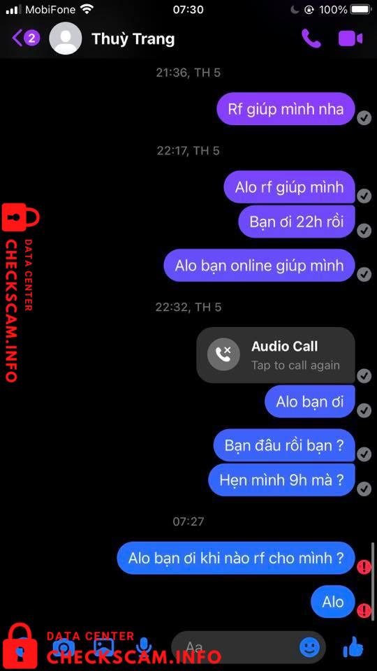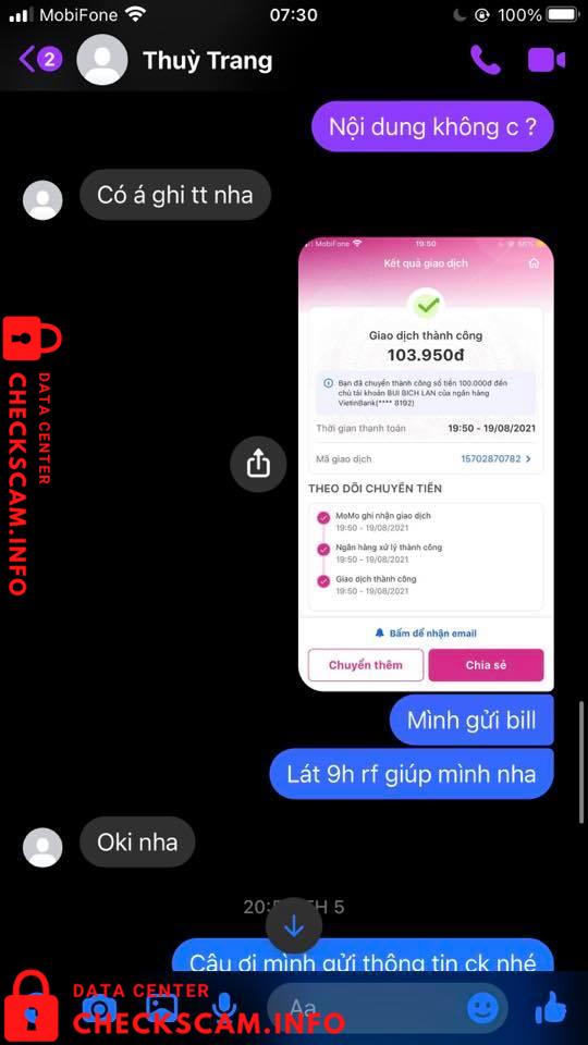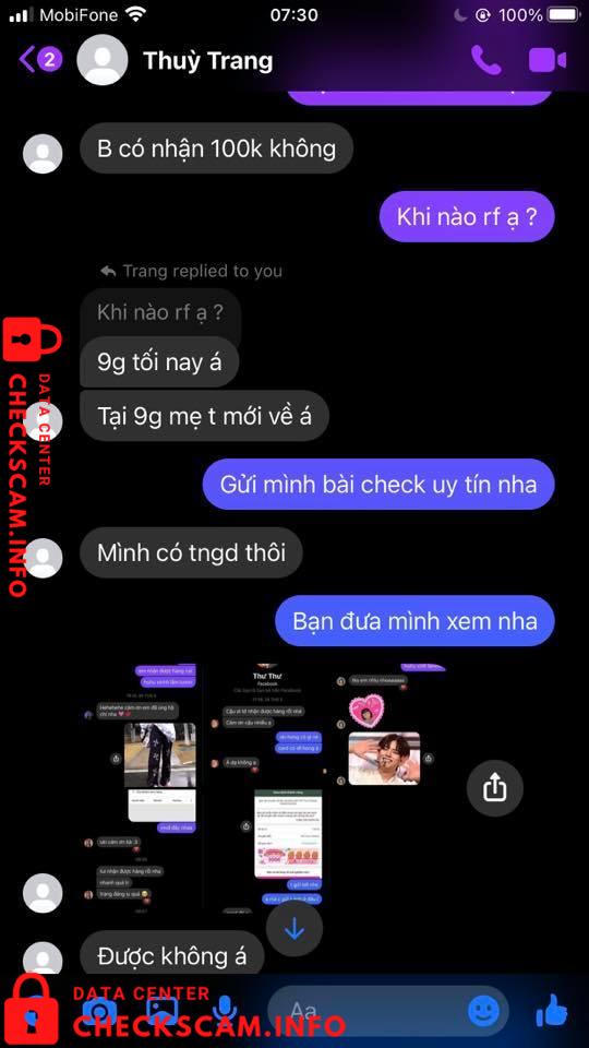 Hôm qua thì bạn Thuỳ Trang có nhắn mình nhờ ck hộ, số tiền là 100k. Hứa hẹn là 9h sẽ rf, thế mà cho đến sáng nay đã block mình hay khoá acc gì đó và trốn mất. Ngoài ra bạn còn đi fake thông tin của một bạn khác và số tài khoản này cũng là đi mượn.