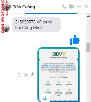 Scammer Alert: Bùi Công Minh Reported: November 16, 2024 Scammer Information Full Name: Bùi Công Minh Payment Gate: VP Bank Payment Account: 215930572 Category: Marketplace scams Source: Checkscam Evidence Files Report Description Lừa đảo COD linh kiện máy tính Comments Your comment Add Comment No comments yet. Be the first to share your experience with this scammer.