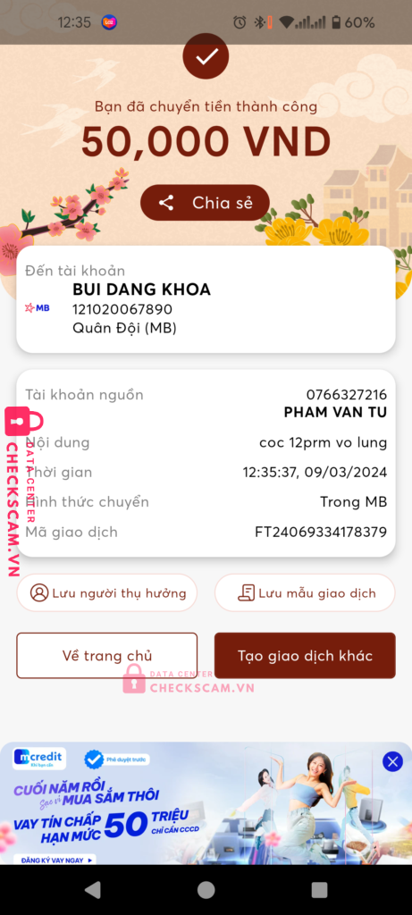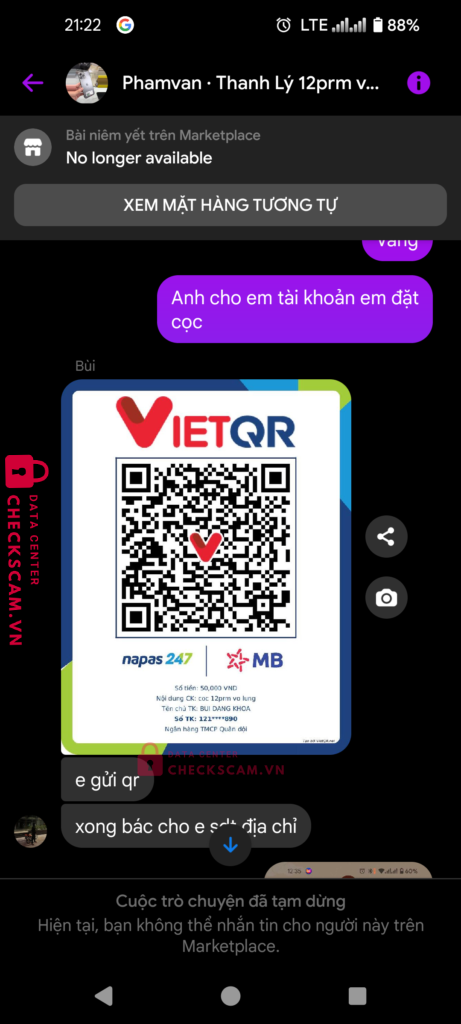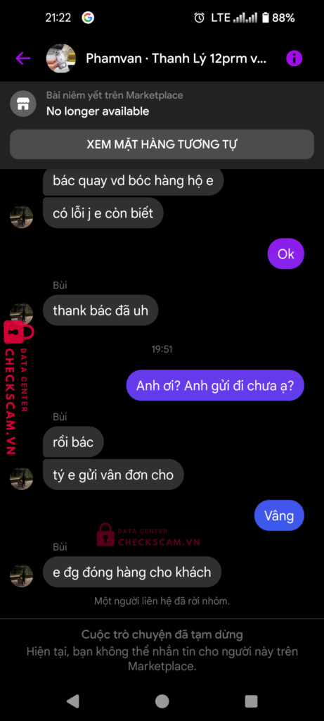 Scammer Alert: Bui dang khoa Reported: November 16, 2024 Scammer Information Full Name: Bui dang khoa Payment Gate: MB Payment Account: 121020067890 Category: Marketplace scams Source: Checkscam Evidence Files Report Description Up iphone 12 promax vỡ lưng, đòi cọc 50k.Đã xóa tài khoản sau khi chuyển cọc Comments Your comment Add Comment No comments yet. Be the first to share your experience with this scammer.