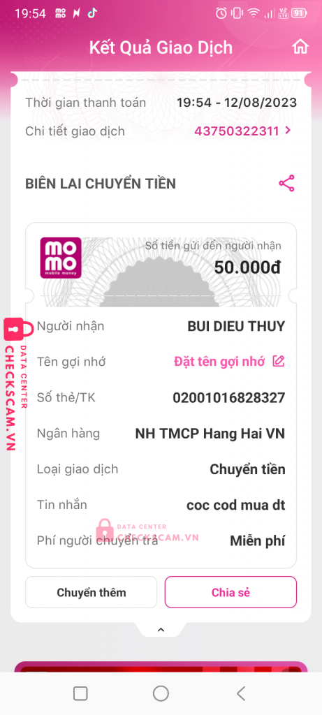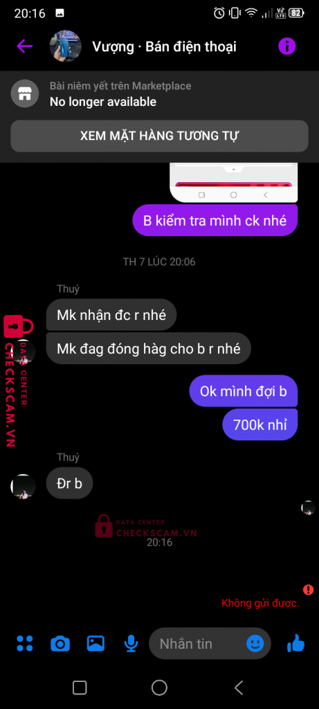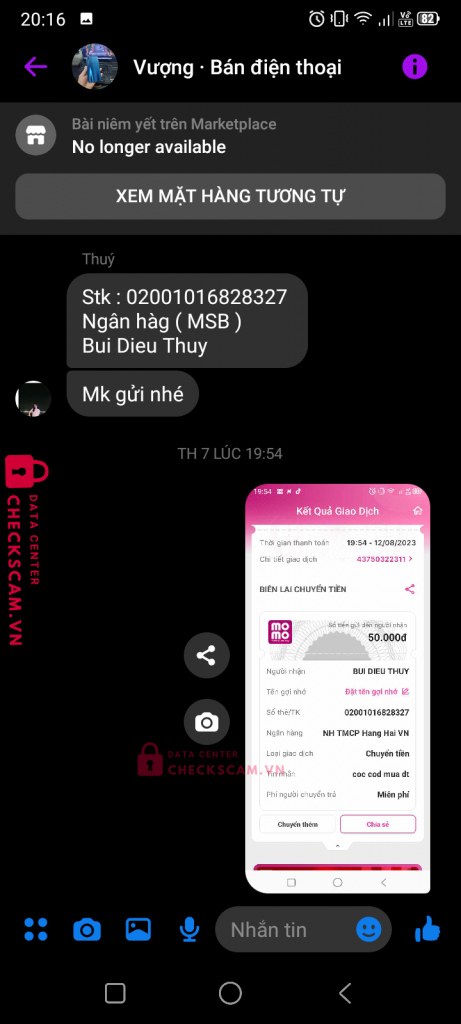 Scammer Alert: Bùi Diệu Thuý Reported: November 16, 2024 Scammer Information Full Name: Bùi Diệu Thuý Payment Gate: MSB Payment Account: 02001016828327 Category: Marketplace scams Source: Checkscam Evidence Files Report Description Đăng bán điện thoại ở market fb lừa cọc cod Comments Your comment Add Comment No comments yet. Be the first to share your experience with this scammer.