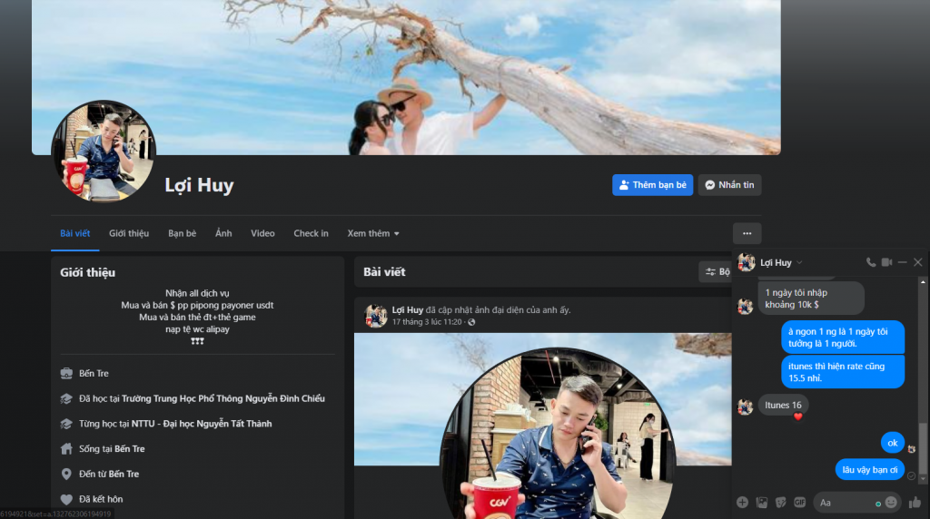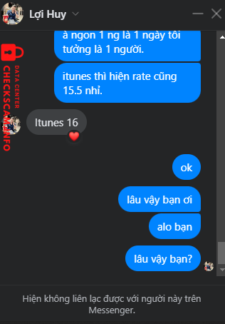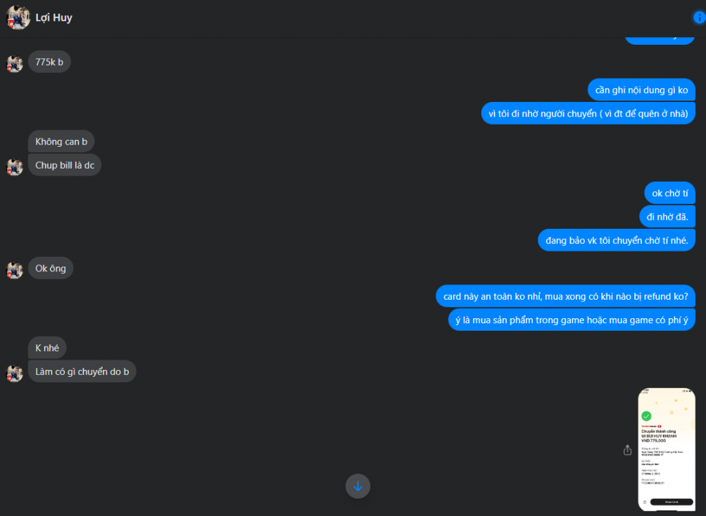 Scammer Alert: Bui huy khánh Reported: November 16, 2024 Scammer Information Full Name: Bui huy khánh Payment Gate: Teckcombank Payment Account: 19035944580017 Category: Marketplace scams Source: Checkscam Evidence Files Report Description Gửi tiền xong là chặn mình luôn, mọi người khi giao dịch thấy thằng này thì né ra nhé. Comments Your comment Add Comment No comments yet. Be the first to share your experience with this scammer.