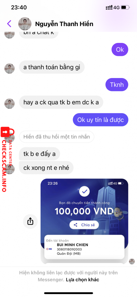 Scammer Alert: Bùi Minh Chiến Reported: November 16, 2024 Scammer Information Full Name: Bùi Minh Chiến Payment Gate: MB Payment Account: 3080118092003 Category: Marketplace scams Source: Checkscam Evidence Files Report Description Comments Your comment Add Comment No comments yet. Be the first to share your experience with this scammer.