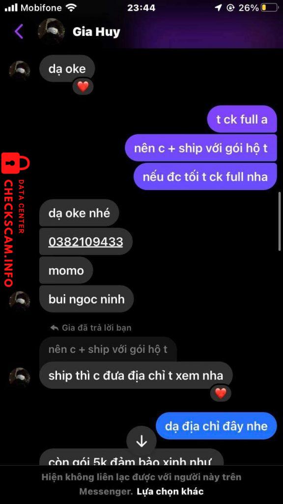 Scammer Alert: BUI NGOC NINH Reported: November 16, 2024 Scammer Information Full Name: BUI NGOC NINH Phone Number: 0382109433 Payment Gate: MOMO Payment Account: 0382109433 Category: Marketplace scams Source: Checkscam Evidence Files Report Description Scammer Comments Your comment Add Comment No comments yet. Be the first to share your experience with this scammer.
