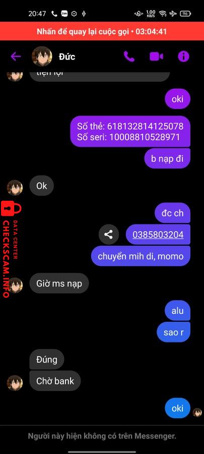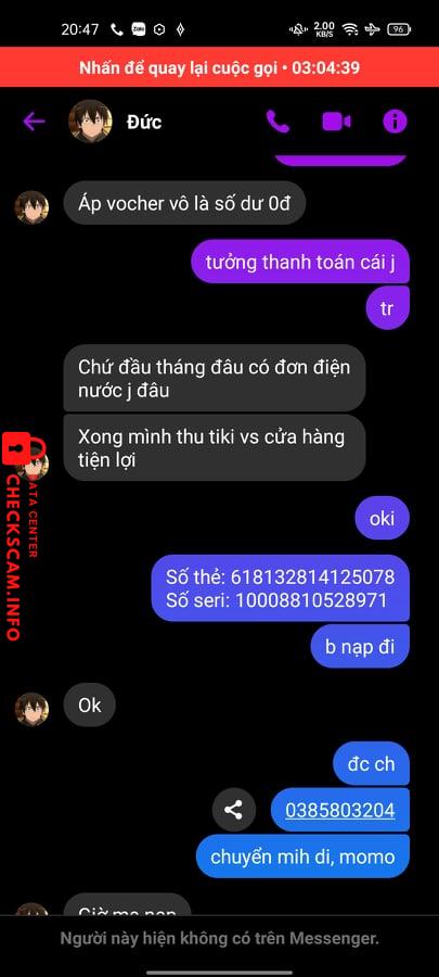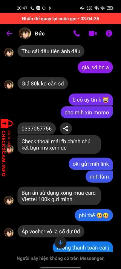 Scammer Alert: Bùi Quang Đức Reported: November 16, 2024 Scammer Information Full Name: Bùi Quang Đức Phone Number: 0337057756 Payment Gate: Momo Payment Account: 0337057756 Category: Marketplace scams Source: Checkscam Evidence Files Report Description Lừa đảo qua Fb bằng cách nhắn tin bảo thanh toán thu mua voucher momo Sau khi đã làm song như thỏa thuận thì không chuyển tiền Comments Your comment Add Comment No comments yet. Be the first to share your experience with this scammer.