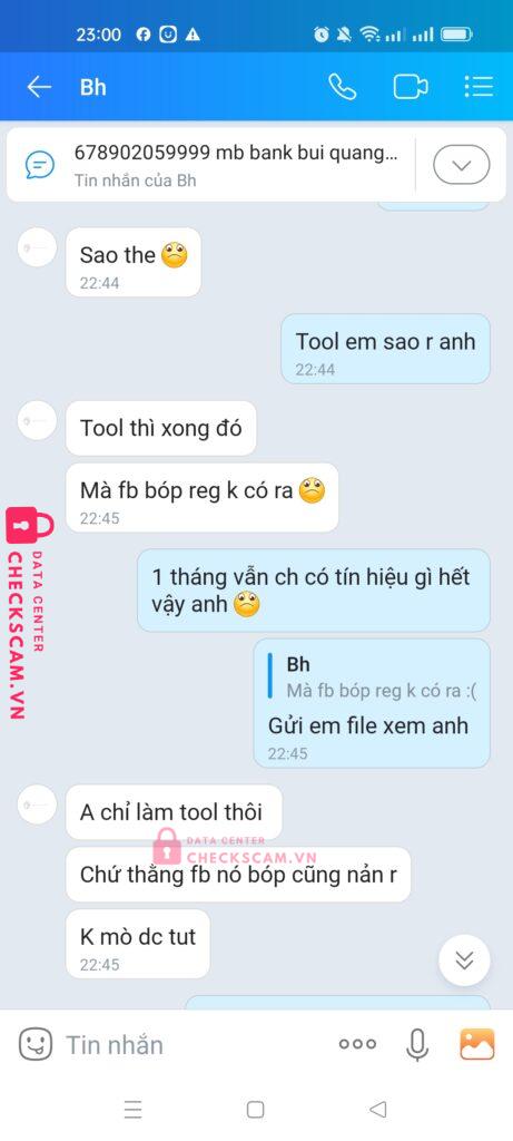 Em có mua tool reg fb ông này từ 30/6/2023 là 400k. Lúc đầu em mua tool reg fb chrome thôi nhưng nghe lời ổng có tool memu giả lập ít die hơn. Thì em cũng đầu tư thêm 300k. Nhưng đến lúc nhận tool để sử dụng thì lúc đầu em reg đc 3acc fb thì tool bắt đầu lỗi. Mà em kêu fixx lỗi thì cứ cò kèo từ ngày này qua tháng nọ đến ngày 4/10 em muốn làm cho ra lẽ thì block em. Còn rất nhiều bằng chứng em muốn up nhưng số lượng giới hạn có 10 ảnh