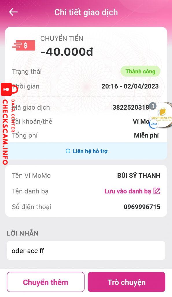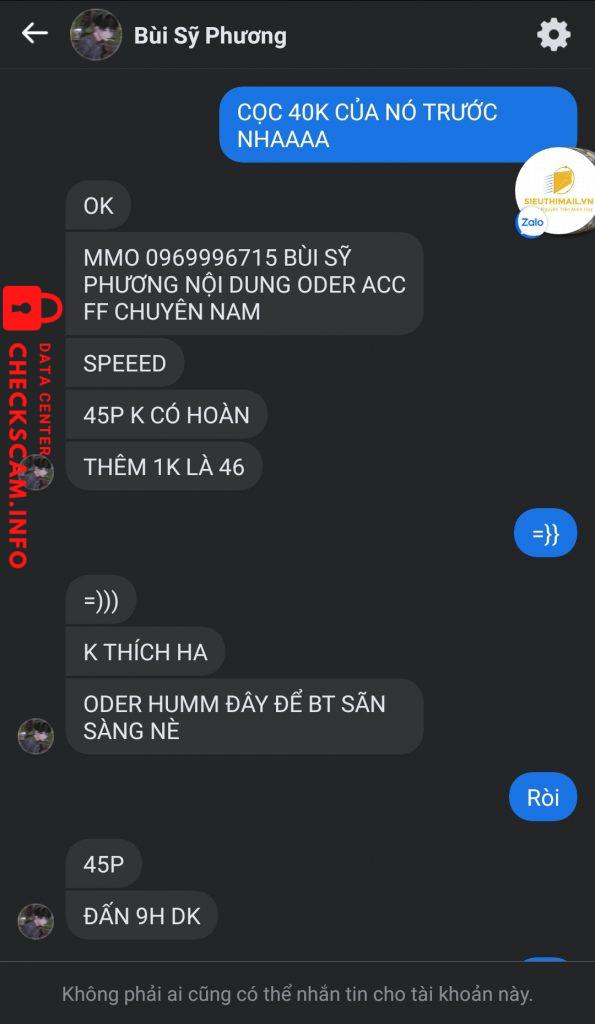 Scammer Alert: BÙI SĨ THANH Reported: November 16, 2024 Scammer Information Full Name: BÙI SĨ THANH Phone Number: 0969996715 Payment Gate: Momo Payment Account: 0969996715 Category: Marketplace scams Source: Checkscam Evidence Files Report Description Tui cọc tiền oder acc game nhờ bạn ý Comments Your comment Add Comment No comments yet. Be the first to share your experience with this scammer.