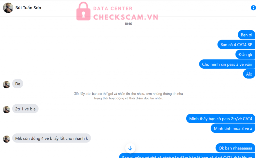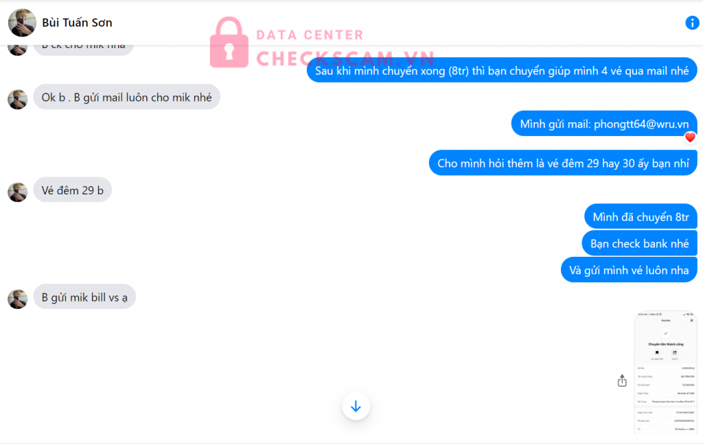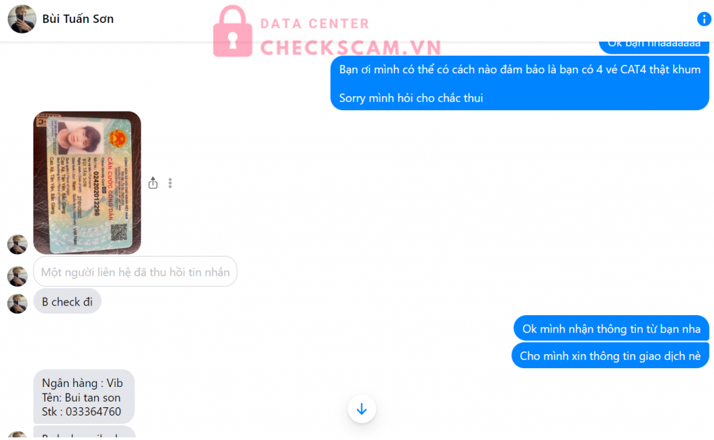 Scammer Alert: Bùi Tấn Sơn Reported: November 16, 2024 Scammer Information Full Name: Bùi Tấn Sơn Payment Gate: VIB Payment Account: 033364760 Category: Marketplace scams Source: Checkscam Evidence Files Report Description Thằng cha này lừa đảo nhé mng, sau khi mình chuyển khoản thì nó ngay lập tức block mình mọi người ạ Comments Your comment Add Comment No comments yet. Be the first to share your experience with this scammer.