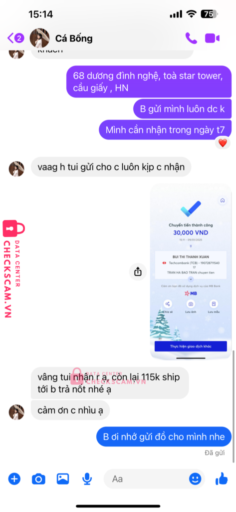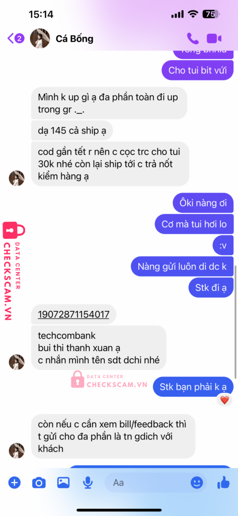 Scammer Alert: BUI THI THANH XUAN Reported: March 7, 2025 Scammer Information Full Name: BUI THI THANH XUAN Payment Gate: Techcombank Payment Account: 19072871154017 Category: Marketplace scams Source: Checkscam Evidence Files Report Description Đăng bài pass đồ xong bắt cọc rồi ko gửi hàng Comments Your comment Add Comment No comments yet. Be the first to share your experience with this scammer.