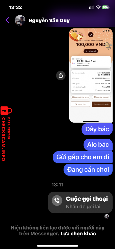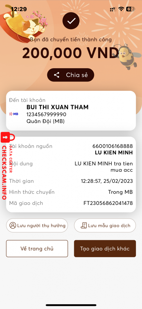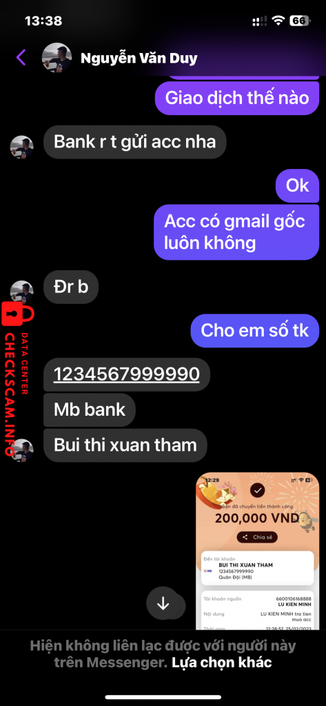 Scammer Alert: Bui Thi xuan Tham Reported: November 16, 2024 Scammer Information Full Name: Bui Thi xuan Tham Payment Gate: MB Payment Account: 1234567999990 Category: Marketplace scams Source: Checkscam Evidence Files Report Description Mình có chuyển khoản mua acc steam 300k ,khi chuyển xong nó chặn mình luôn.anh em nên cảnh giác với nó Comments Your comment Add Comment No comments yet. Be the first to share your experience with this scammer.