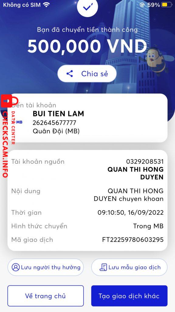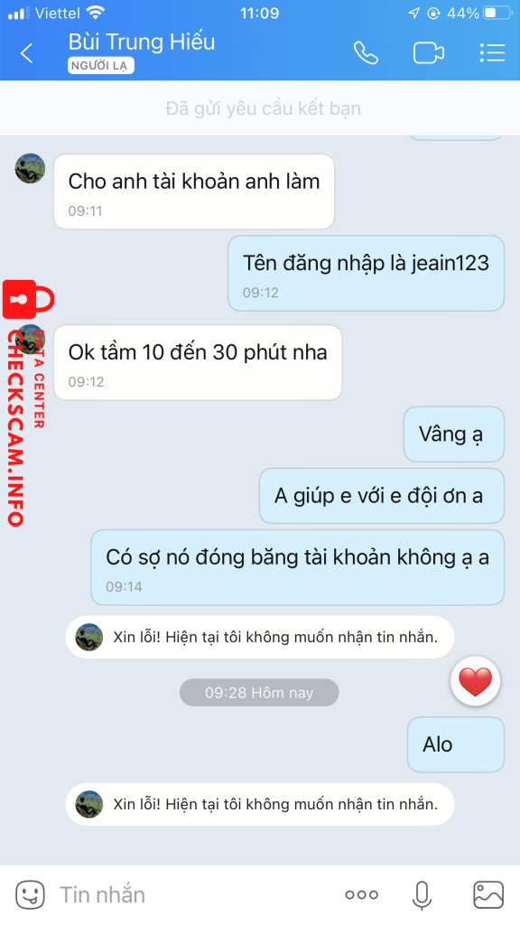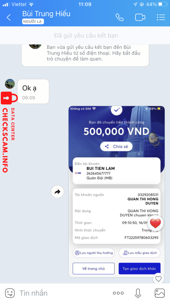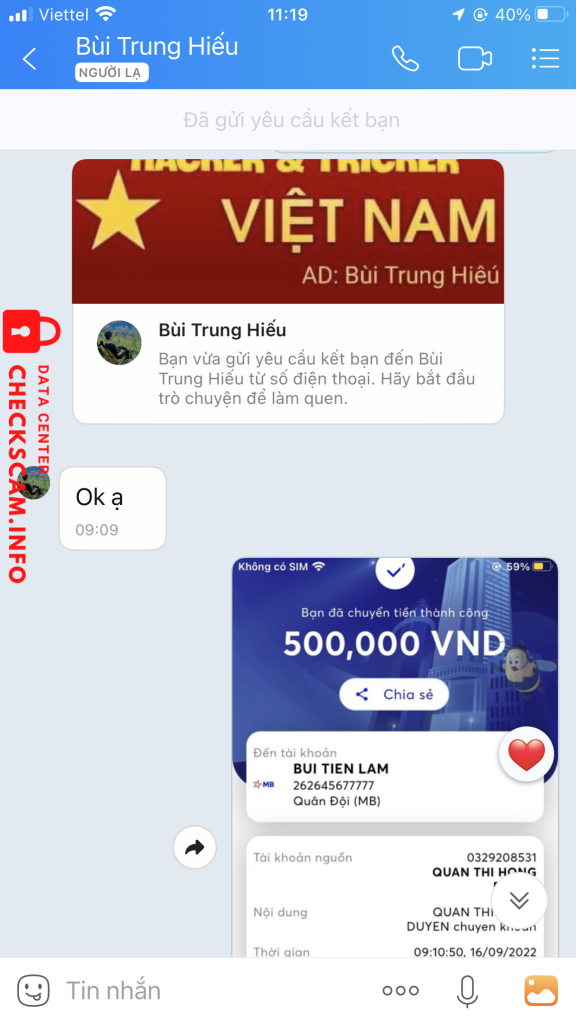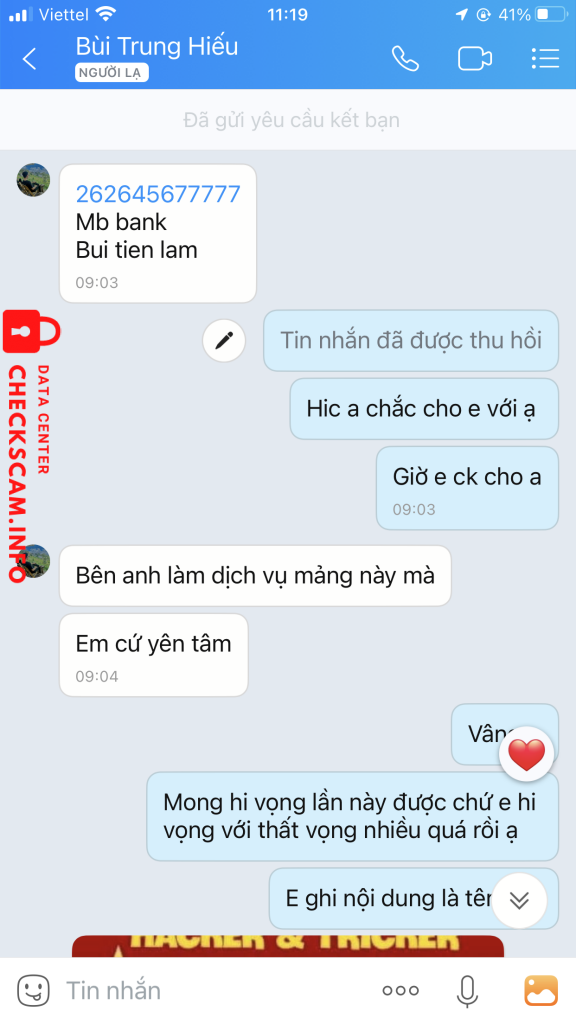 Scammer Alert: Bùi trung hiếu Reported: November 16, 2024 Scammer Information Full Name: Bùi trung hiếu Phone Number: 0399508410 Payment Gate: Mb Payment Account: 262645677777 Category: Marketplace scams Source: Checkscam Evidence Files Report Description Lừa ck , nhận tiền xong thì chặn tin nhắn ạ Comments Your comment Add Comment No comments yet. Be the first to share your experience with this scammer.