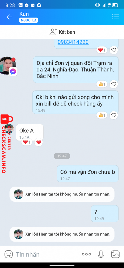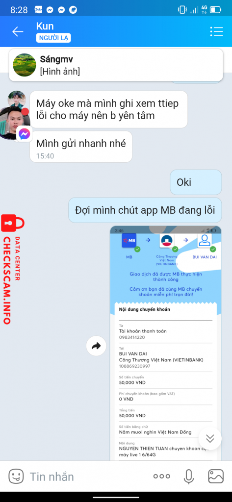 Scammer Alert: Bui Van Dai Reported: November 16, 2024 Scammer Information Full Name: Bui Van Dai Payment Gate: Viettin bank Payment Account: 108869230997 Category: Marketplace scams Source: Checkscam Evidence Files Report Description Lừa đảo tiền cọc điện thoại của mình. Nên khoá tài khoản lại Comments Your comment Add Comment No comments yet. Be the first to share your experience with this scammer.